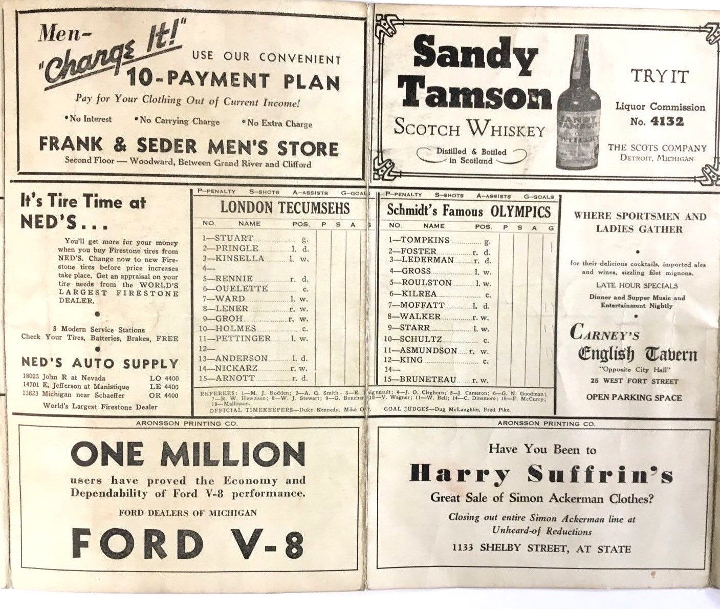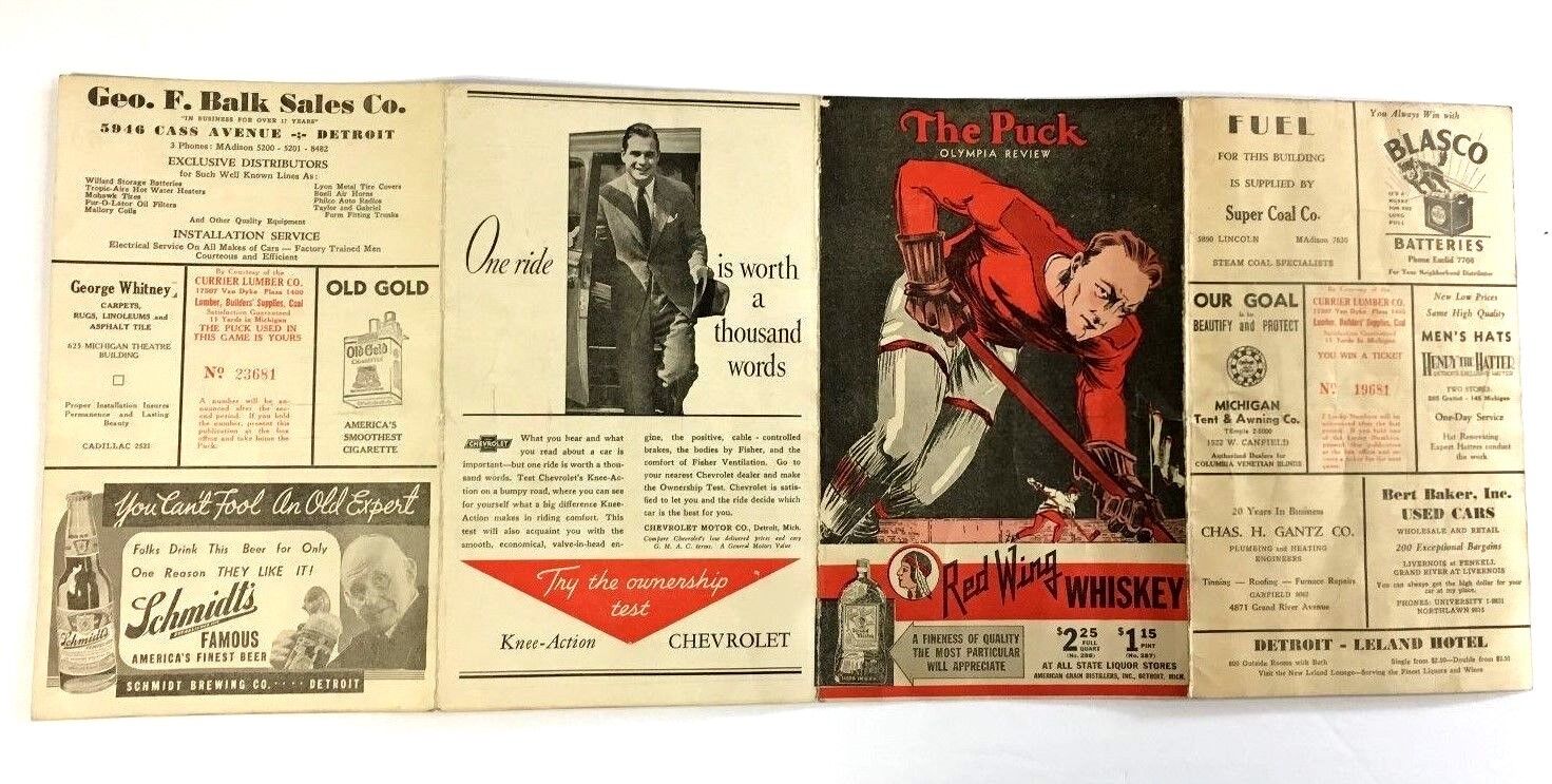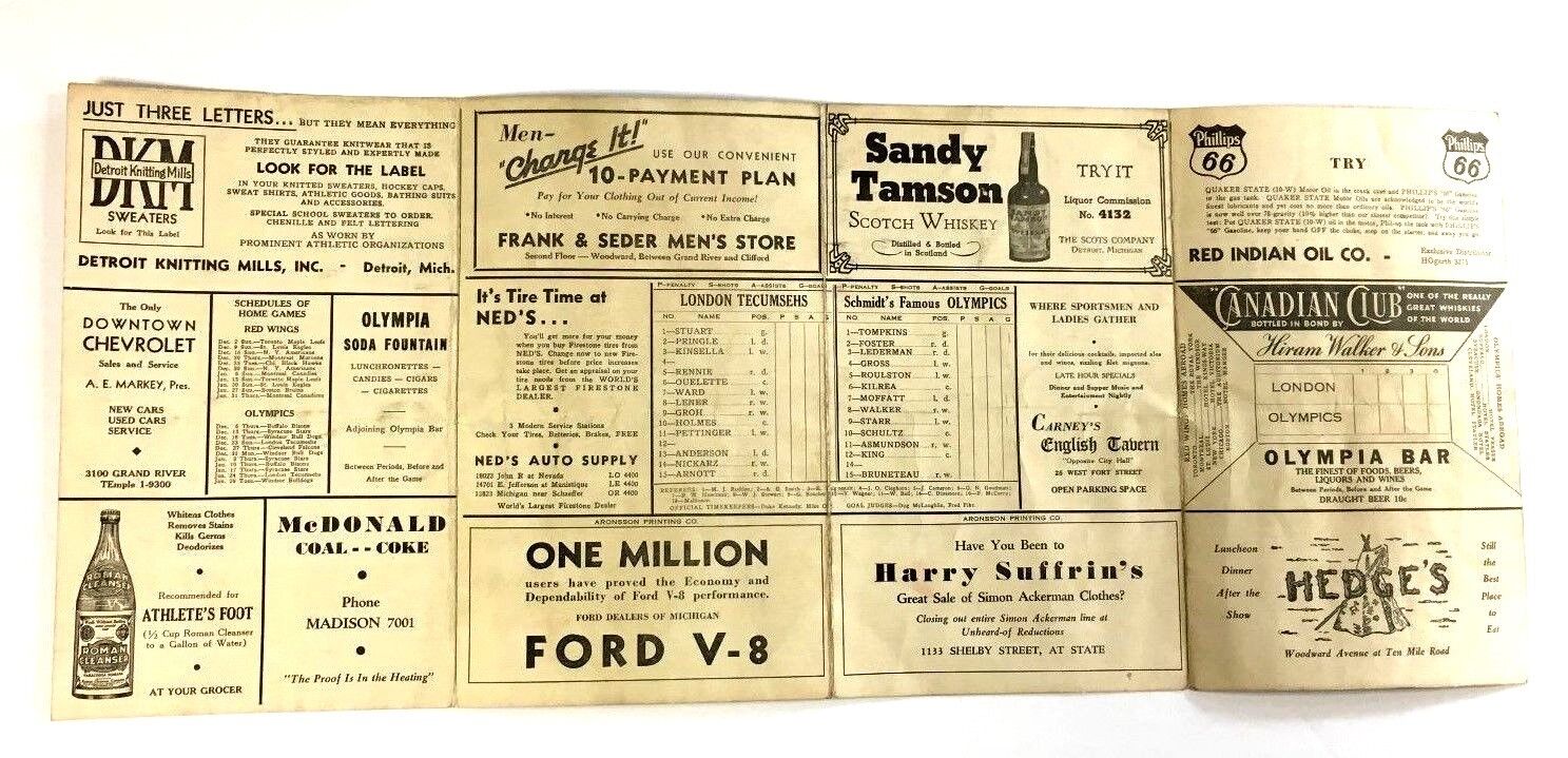 • Rare scorecard from December 23, 1934 International League Hockey Game played at Olympia in Detroit. Detroit's Schmidt's Famous Olympics vs London Tecumsehs