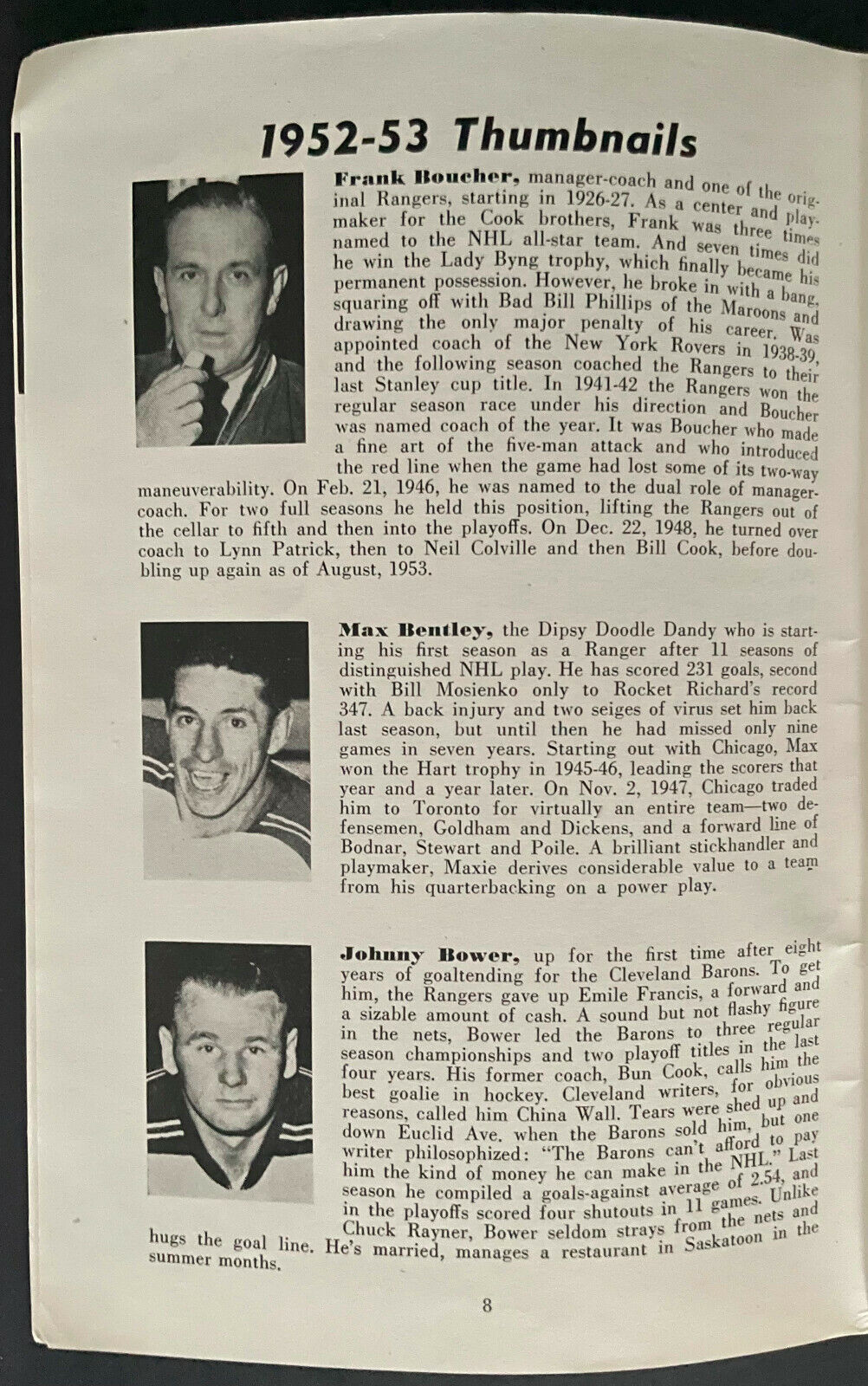 - 1953-54 New York Rangers Blue Book media guide with photos of players with Bio's that includes Hall of Famers and a 29 year old rookie Johnny Bower