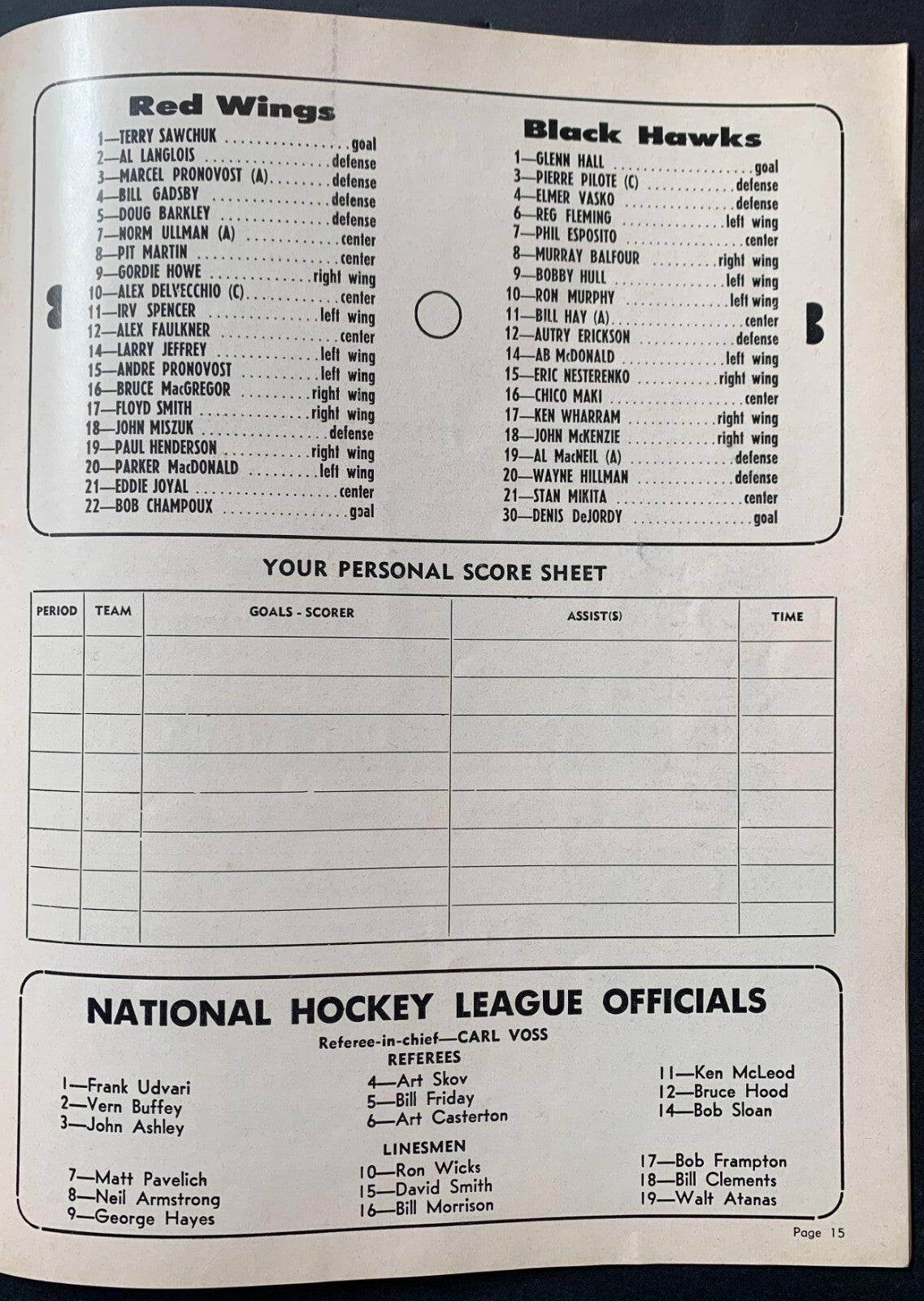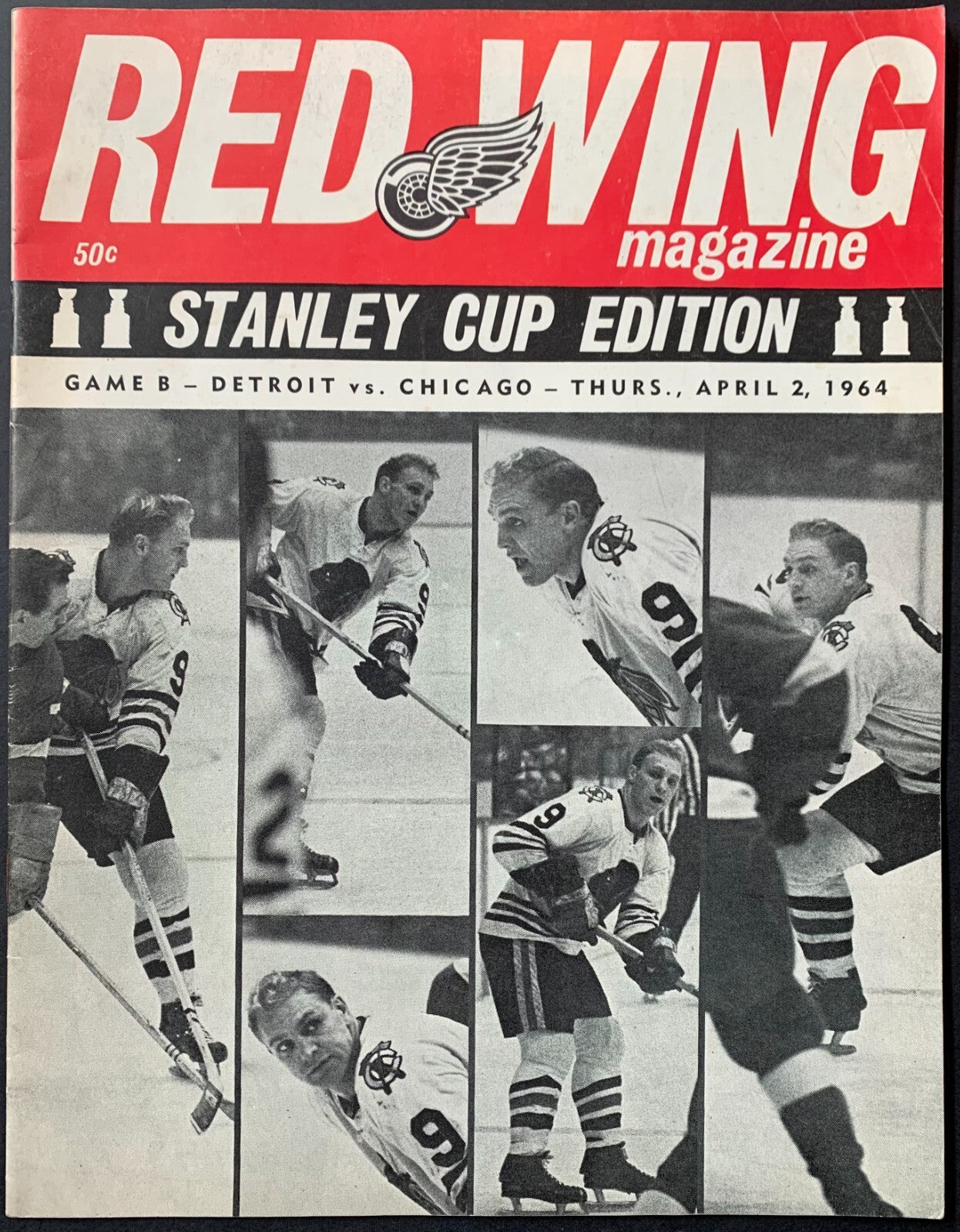 - April 2, 1964 program of game 4 Stanley cup semi-final between the Chicago Blackhawks and Detroit Red Wings. Blackhawks beat Red Wings 3-2 in overtime. M. Balfour scores in OT
