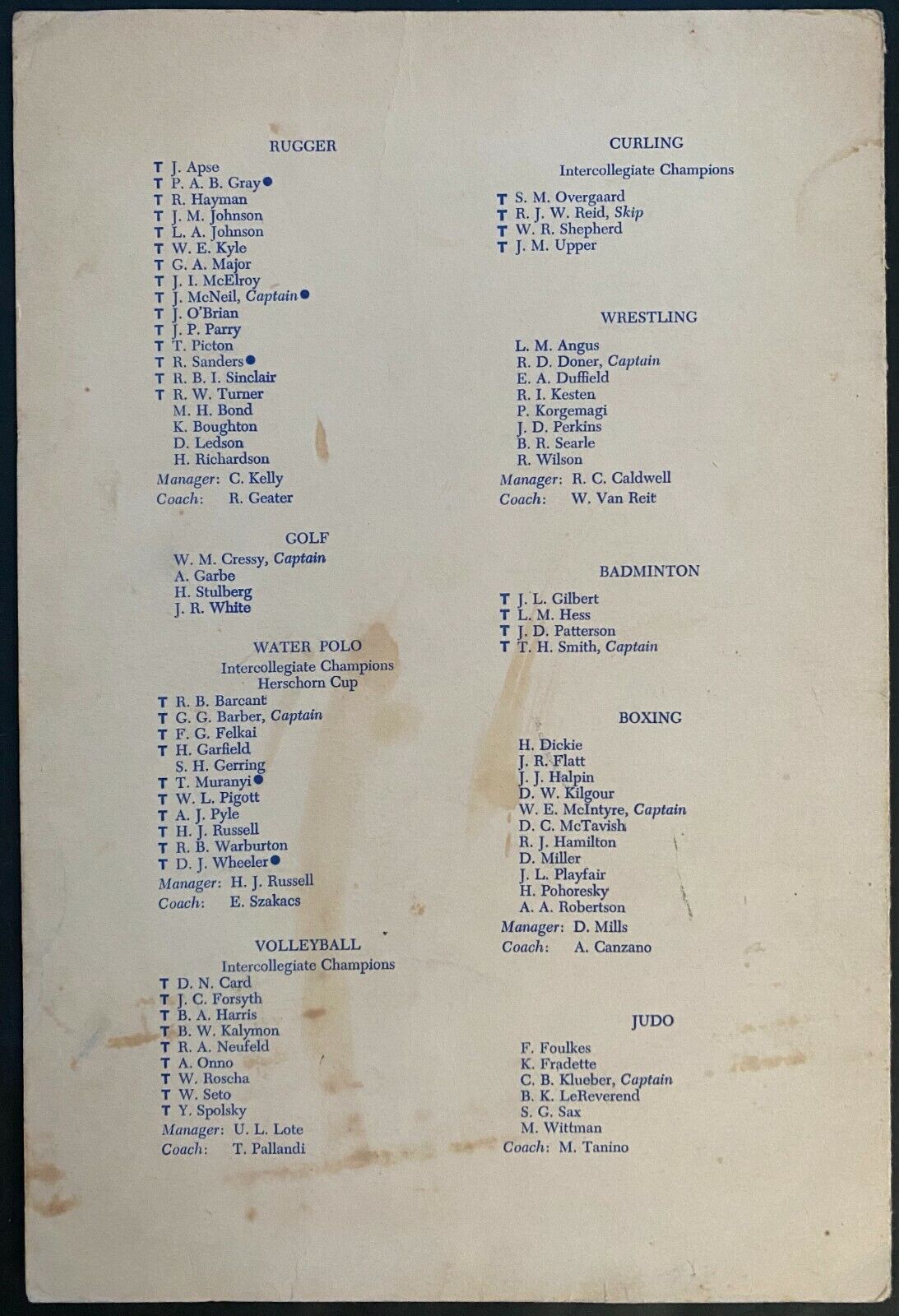 - March 15, 1966 University Of Toronto Canada Annual Athletic Banquet Program of the Varsity Blues Ice Hockey Team
