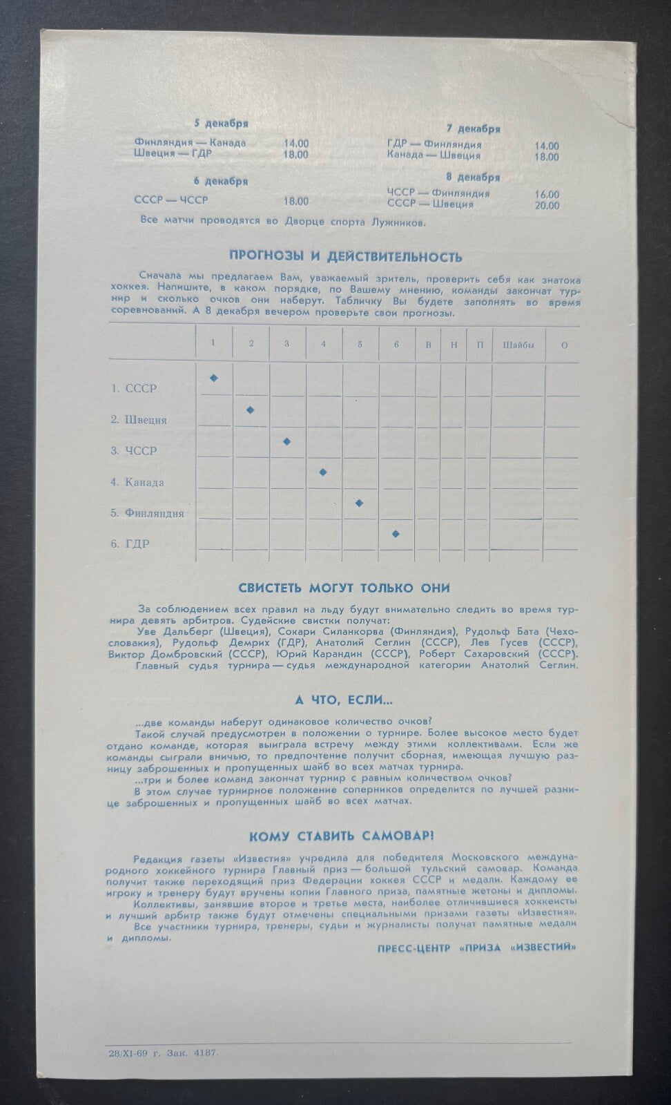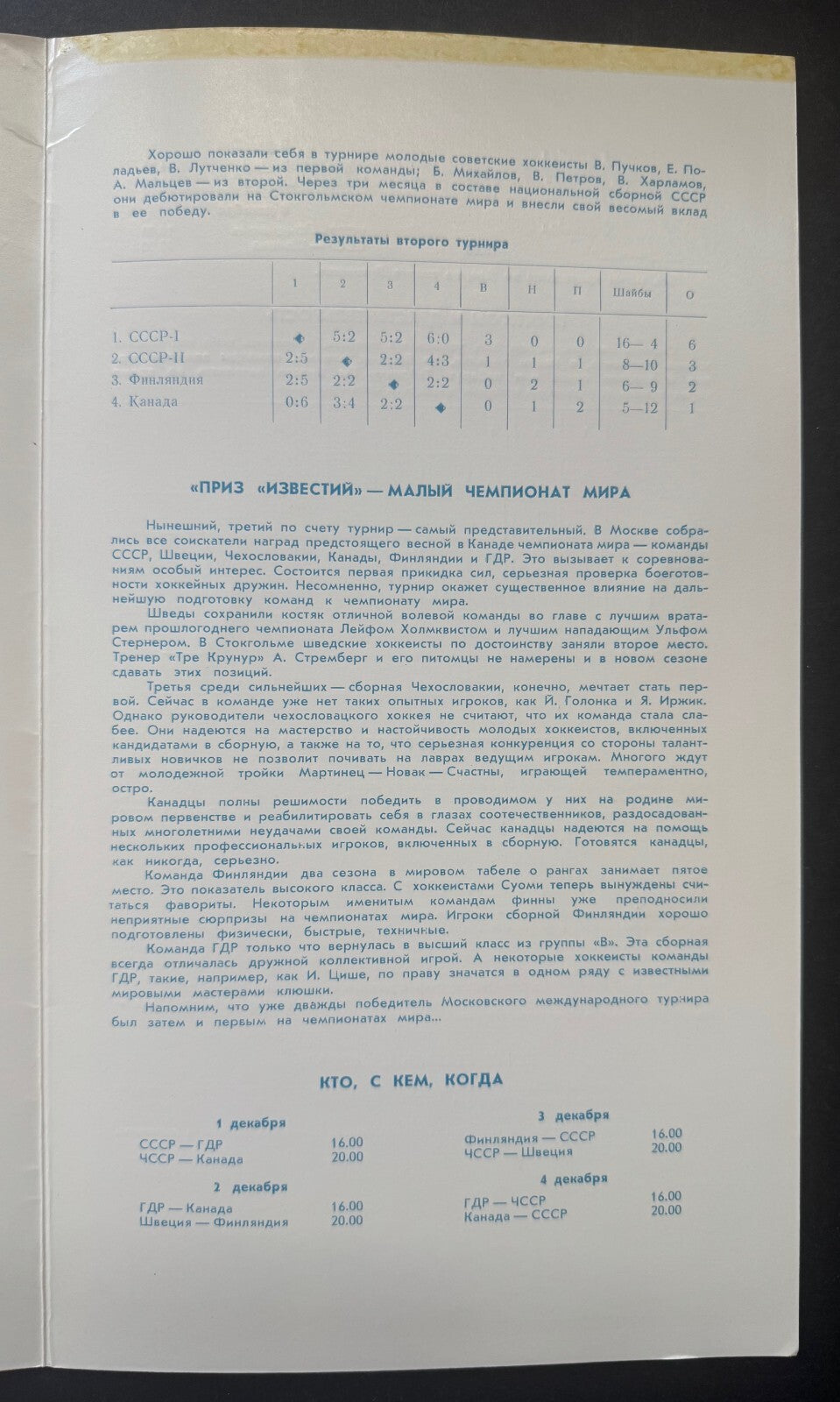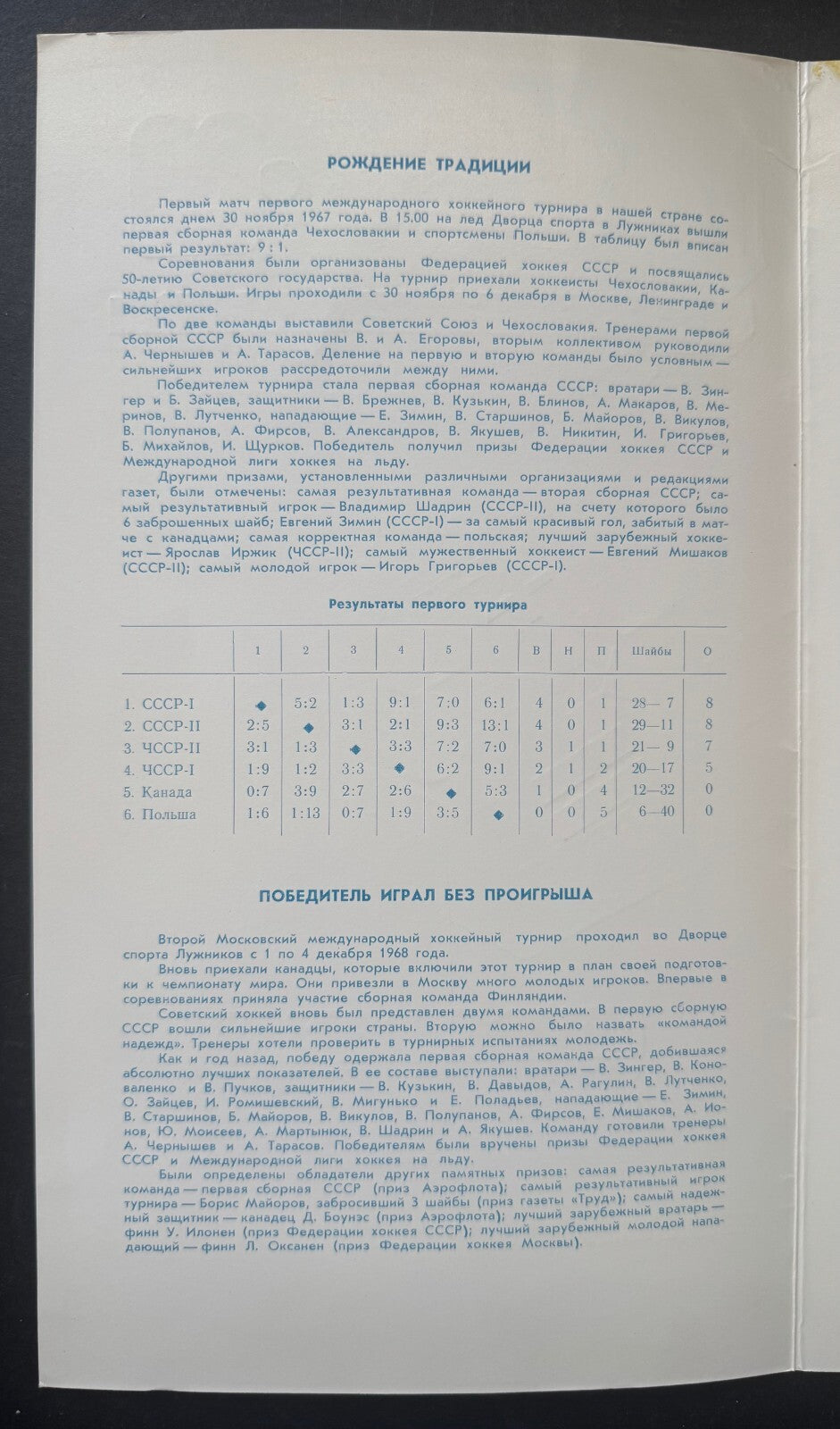 • Inestia tournament held Dec. 1-8, 1969 in Moscow. USSR wins tournament, Canada finishing 2nd, Czech finishes 3rd, Sweden 4th, Finland 5th and East Germany 6th
