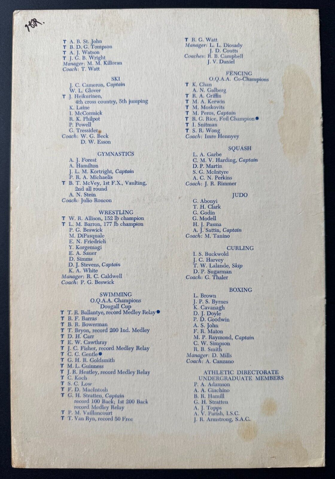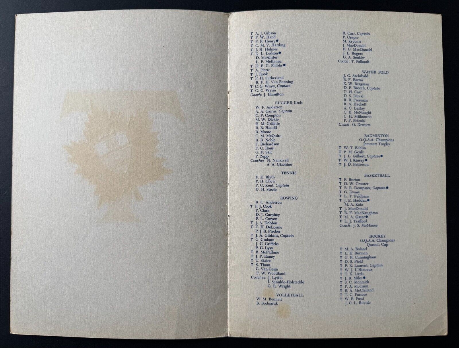 • Canadian University Champion Ice Hockey team University Of Toronto Varsity Blues team signed athletic banquet program