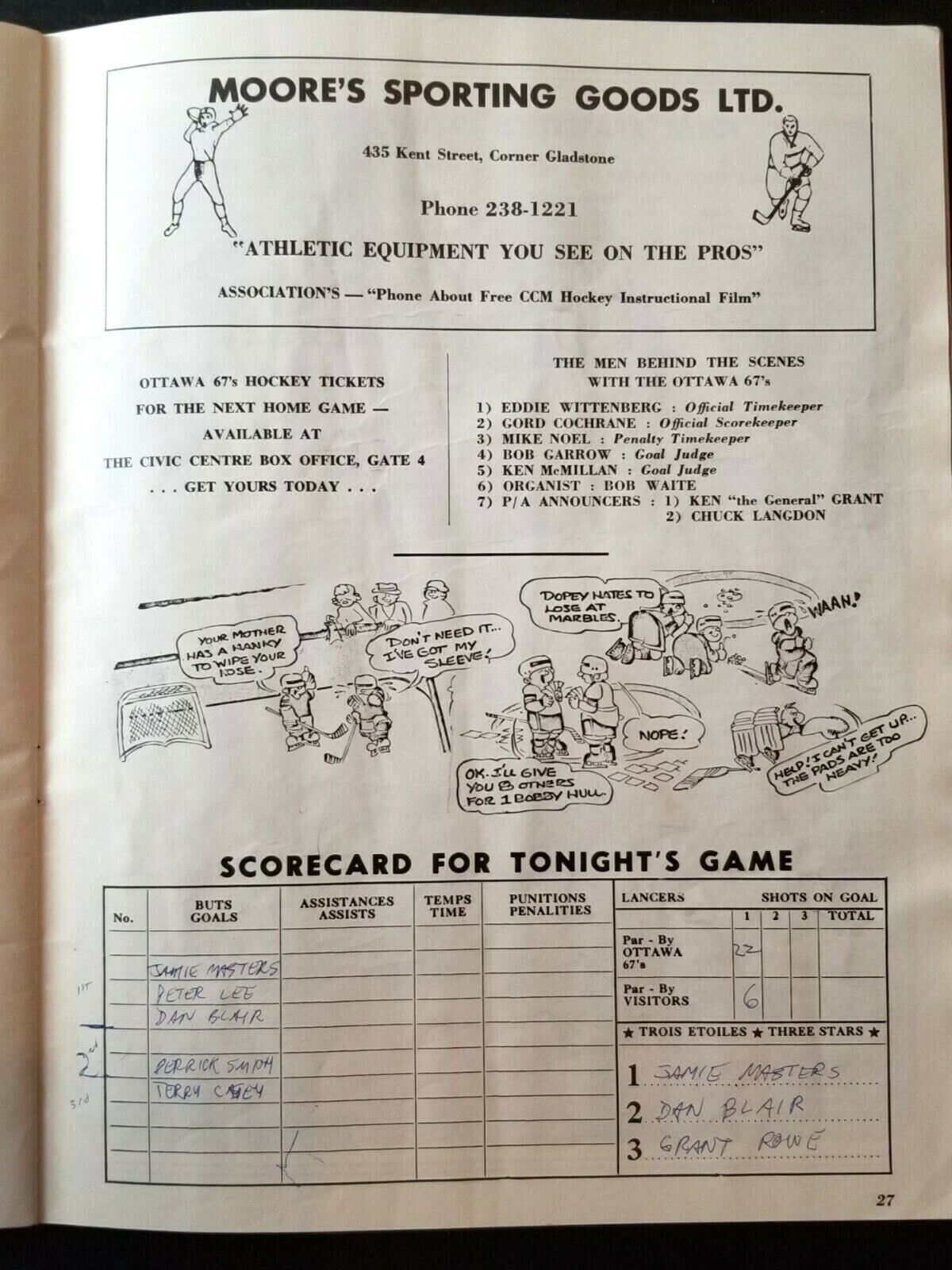 • Team names and score (Ottawa 6-3) as well as attendance written on the front cover