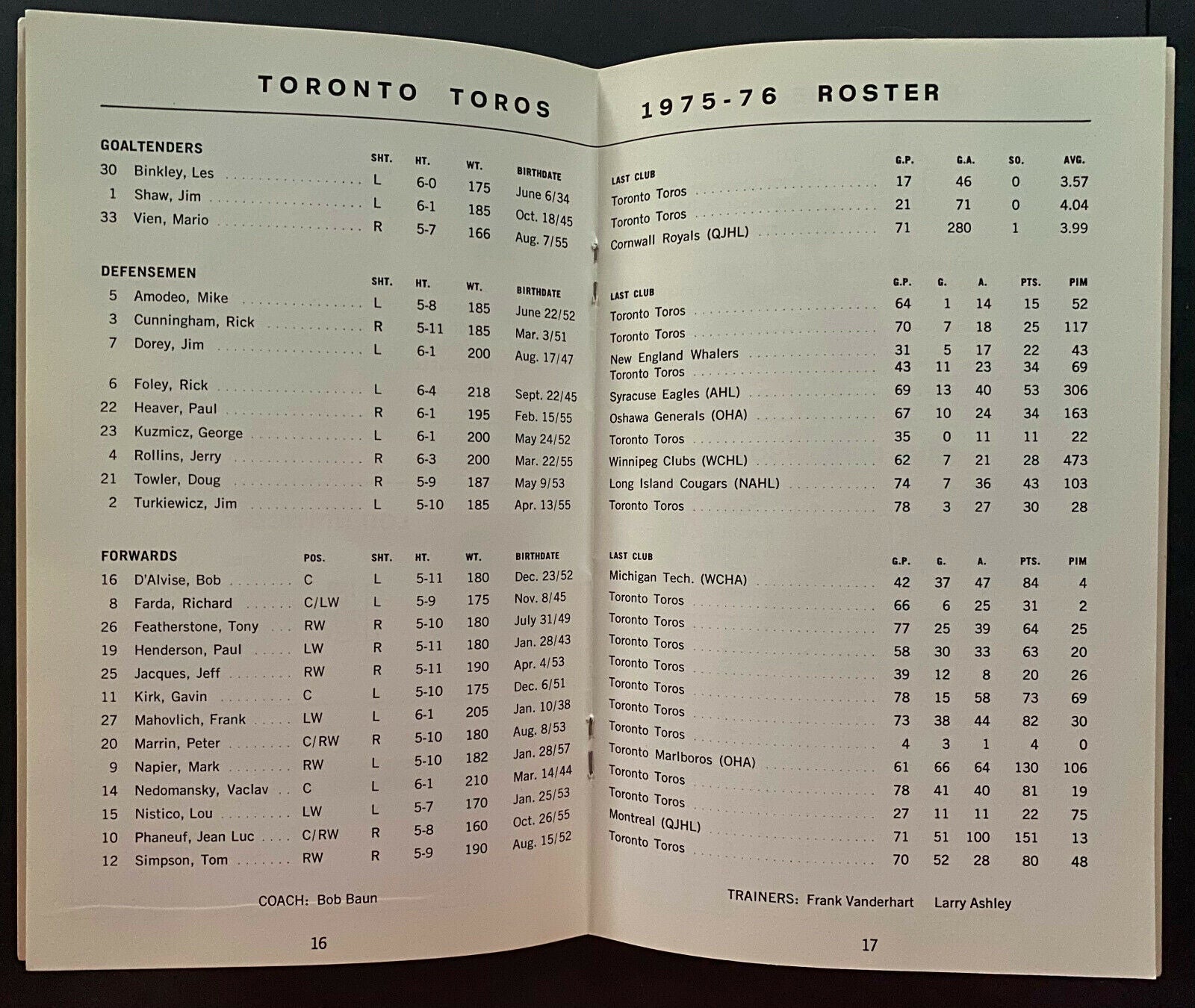 1975-76 Toronto Toros Media Guide Action Guide WHA World Hockey Association