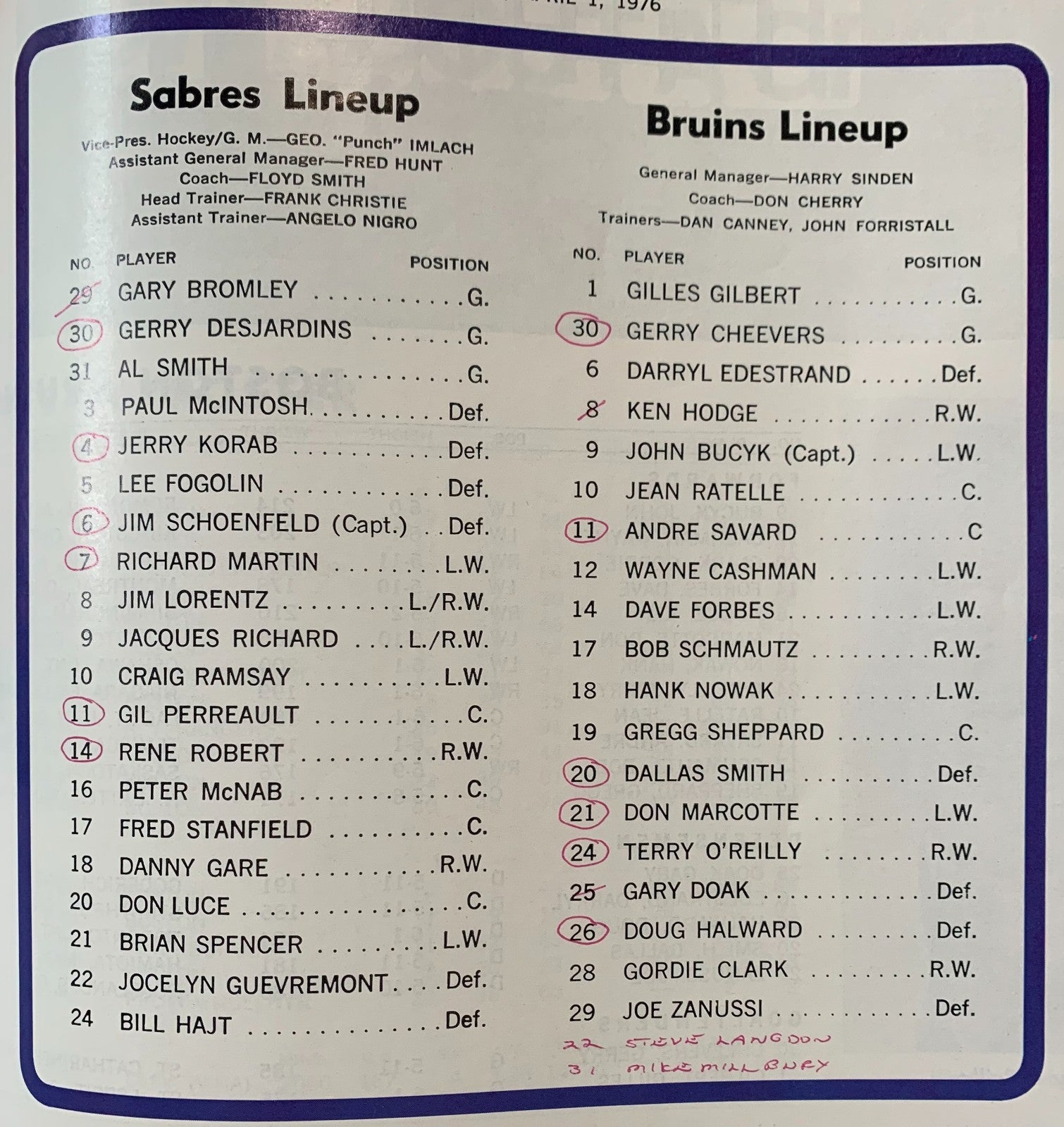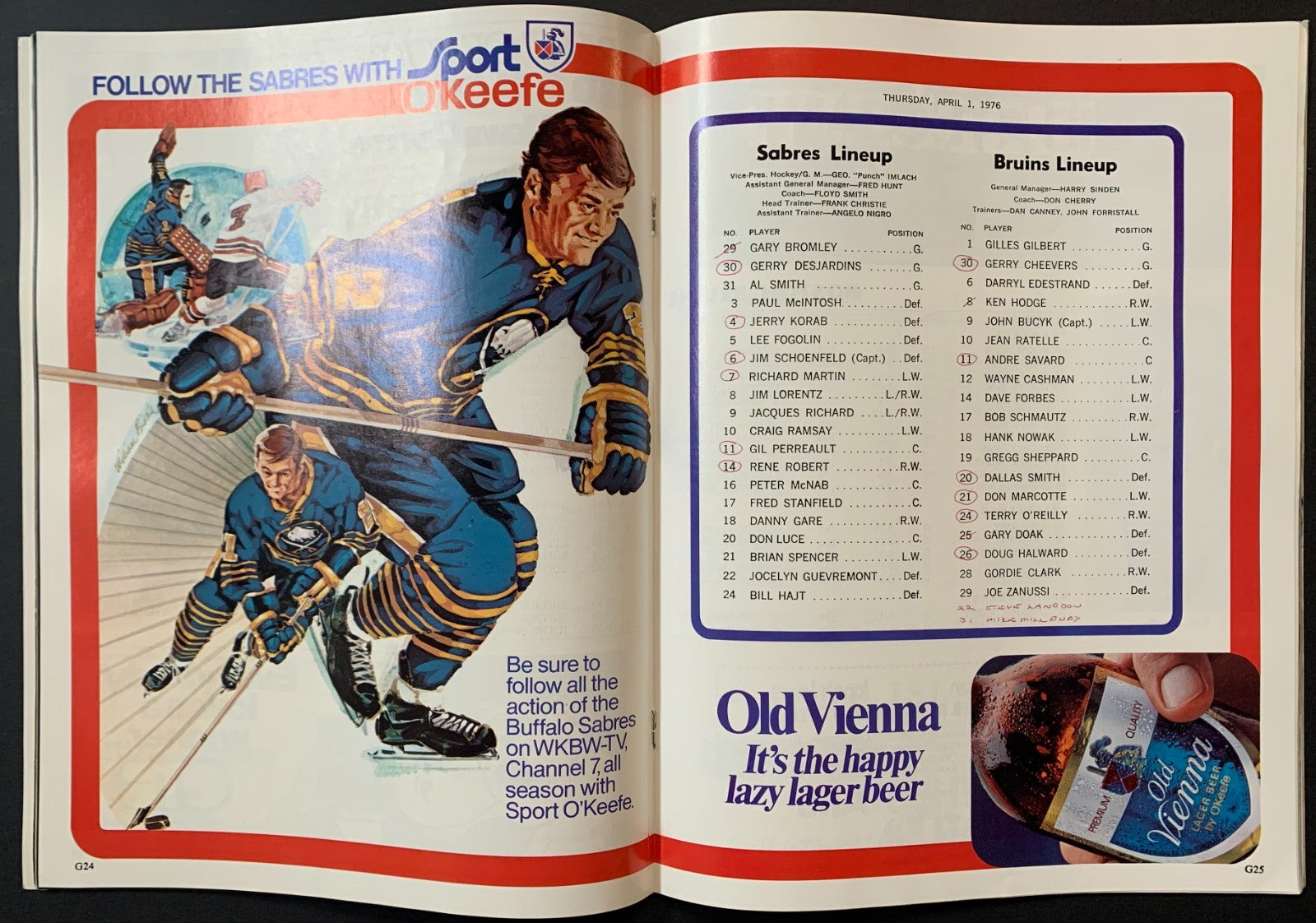 - Program for Apr. 1, 1976 game at Memorial Auditorium in Buffalo between the Buffalo Sabres and Boston Bruins. Sabres defeat Bruins 7-2