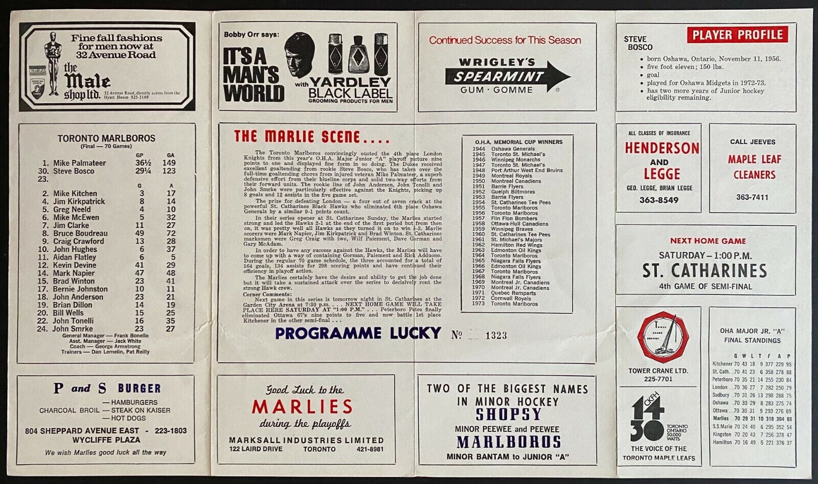 - April 1974 OHA Junior A hockey program for the semi-final of the OHA playoffs between the St. Catherine's Blackhawks and the Toronto Marlies