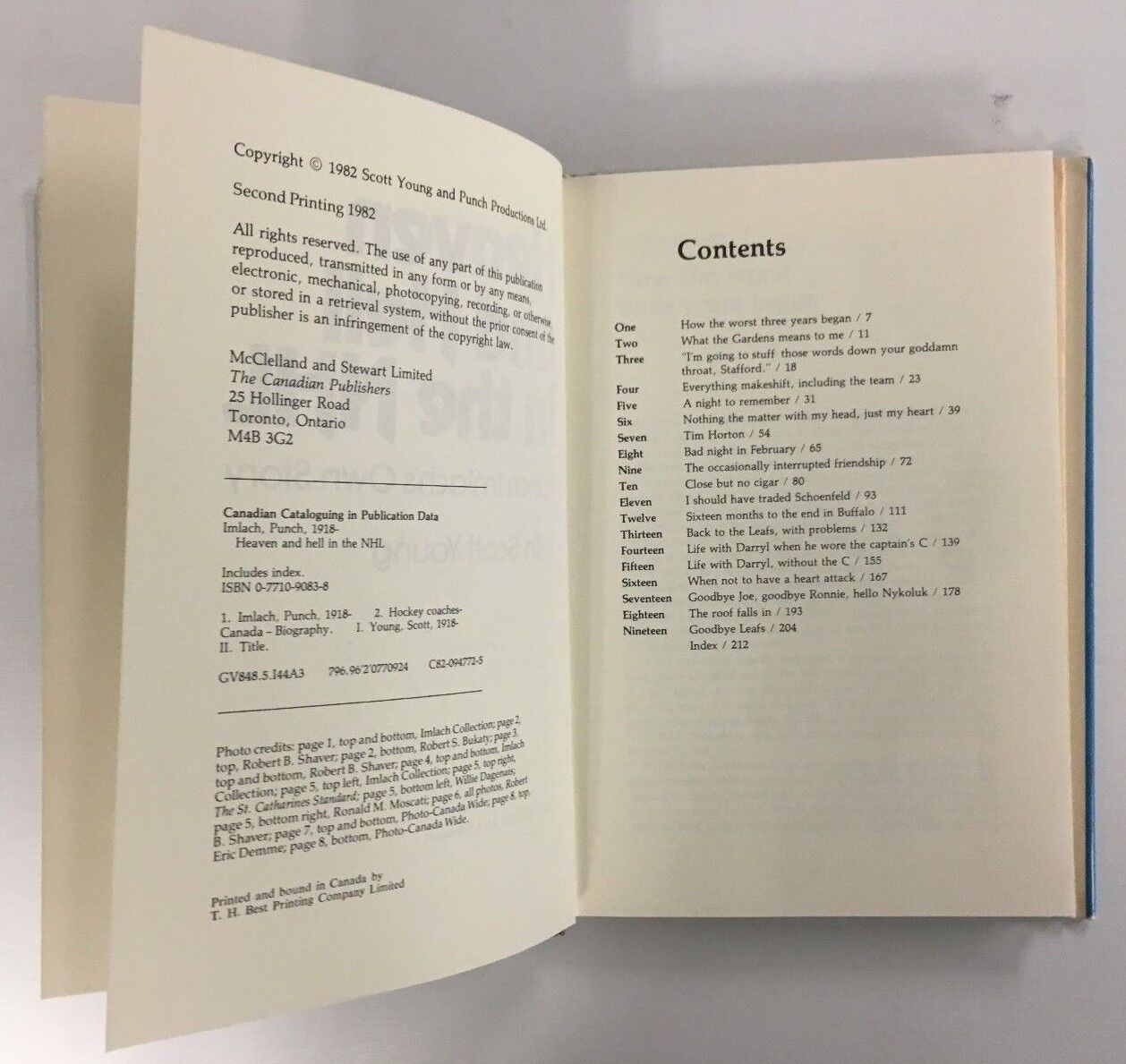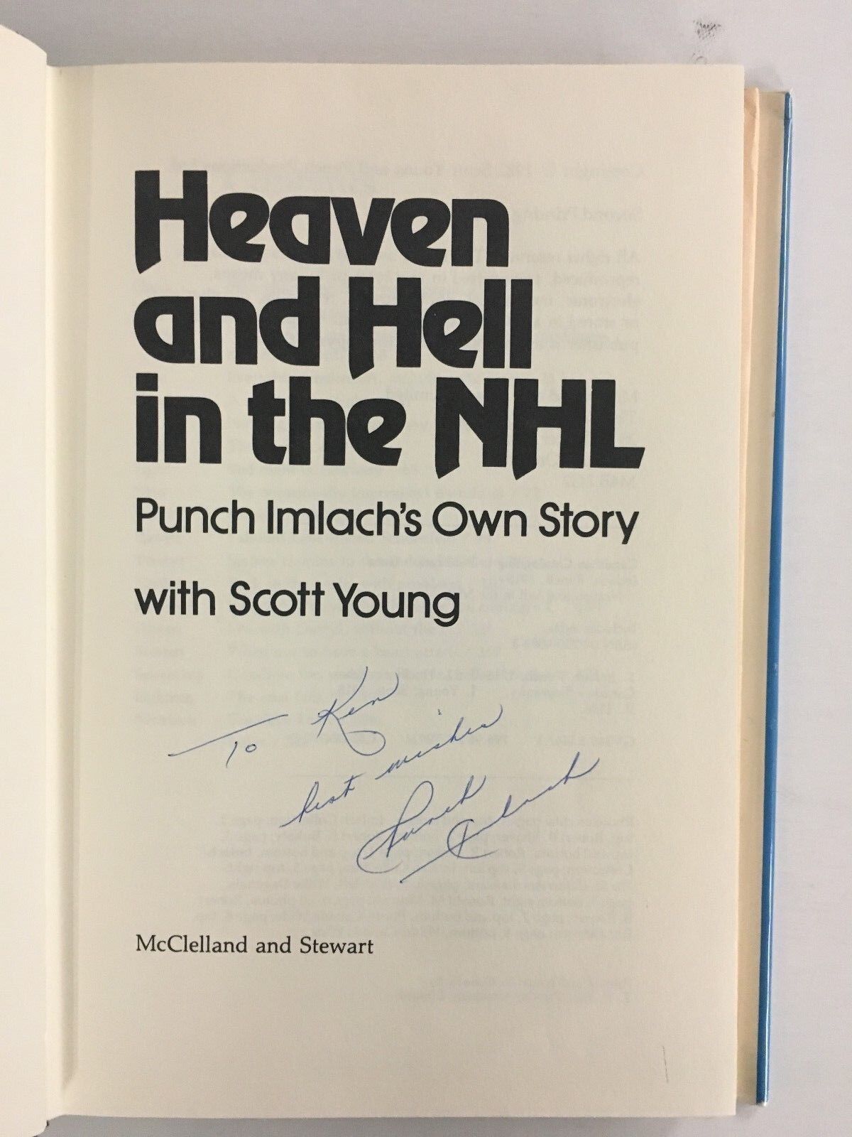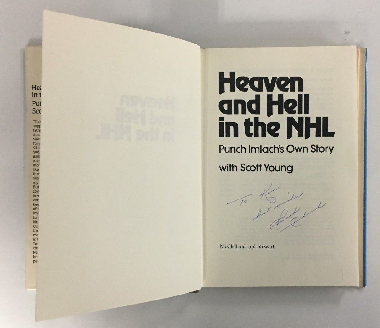 - 1982 Punch Imlach's Own Story "Heaven and Hell in the NHL with Scott Young book autographed on the inside on the inside by hall of fame coach Punch Imlach