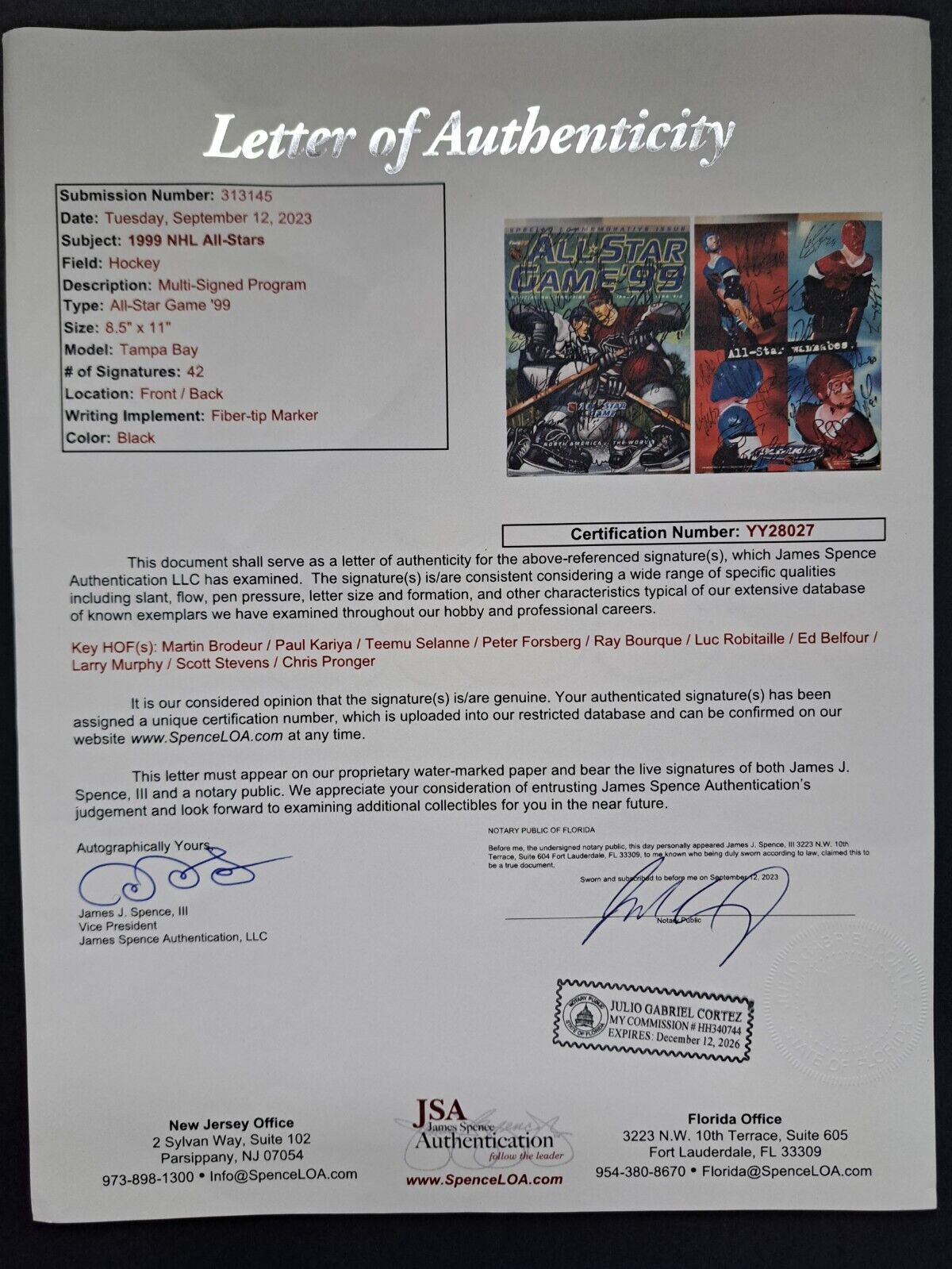 • January 24th, 1999 49th NHL All-Star Game autographed program, signed by 42 NHLers, authenticated by JSA