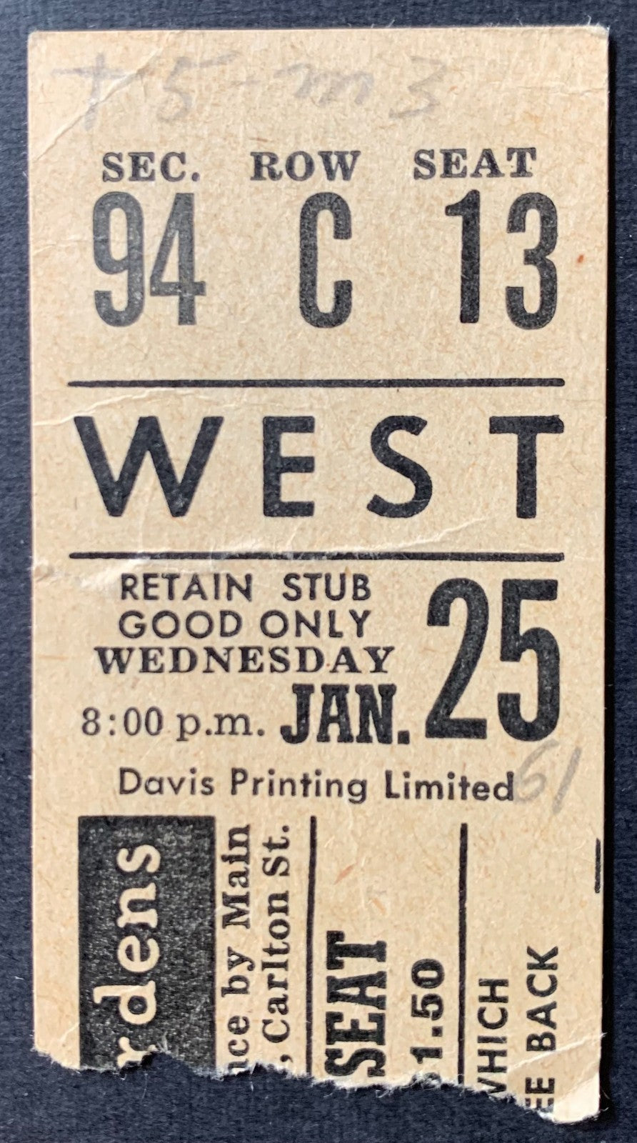 • Jan. 25, 1961 ticket stub for game at Maple Leaf Gardens between the Toronto Maple Leafs and Montreal Canadiens. Leafs defeat Canadiens 5-2. Frank Mahovlich socres 2 goals.