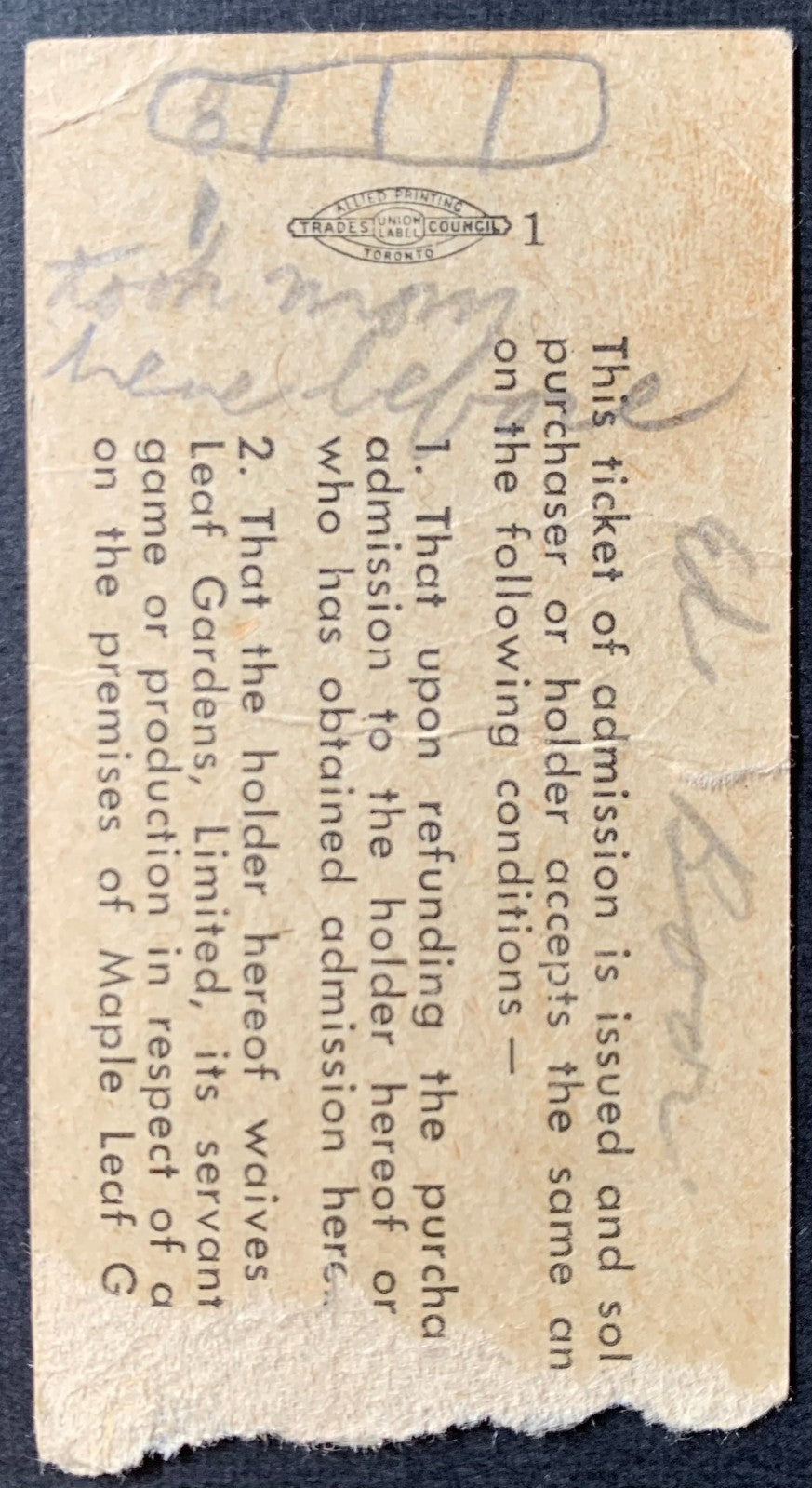 • 1961 Maple Leaf Gardens Ticket Stub