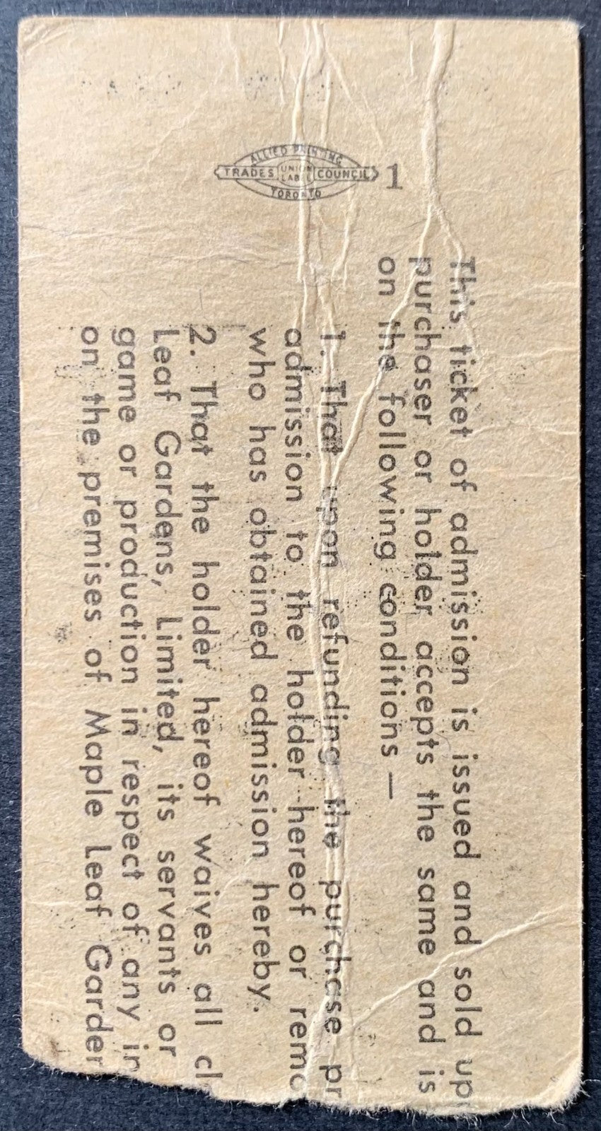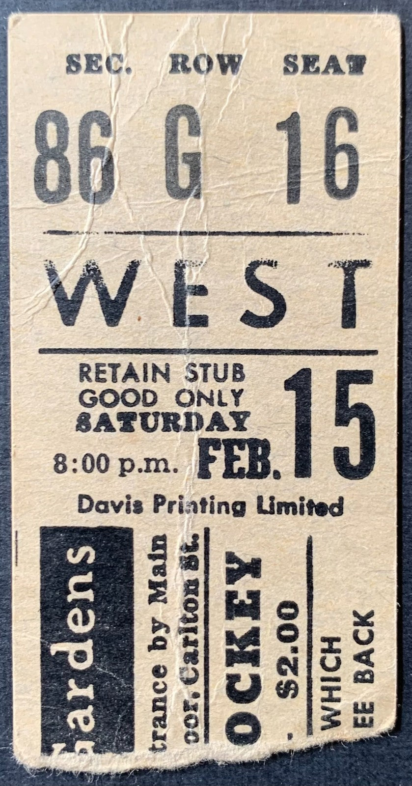 - Ticket stub for Feb. 15, 1964 game at Maple Leaf Gardens in Toronto between the Toronto Maple Leafs and Chicago Blackhawks. Leafs defeat Blackhawks 4-0. Johnny Bower records shutout