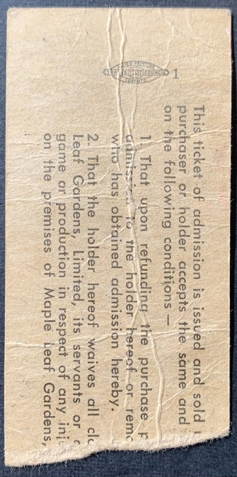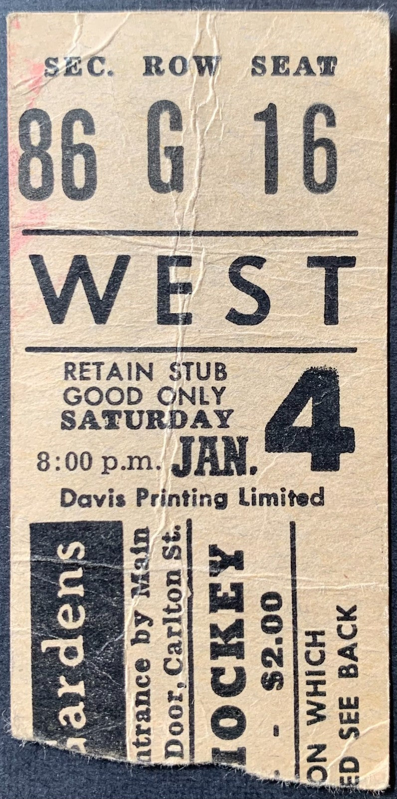 - Ticket stub for Jan. 4, 1964 game at Maple Leaf Gardens in Toronto between the Toronto Maple Leafs and Chicago Blackhawks. Leafs defeat Blackhawks 3-0. Johnny Bower records shutout