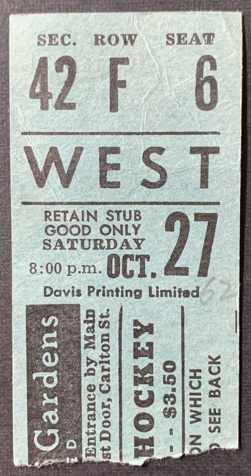 - Oct. 27, 1967 ticket stub for game at Maple Leaf Gardens between the Toronto Maple Leafs and New York Rangers. Rangers defeat Leafs 5-1. Jean Ratelle scores 2 goals