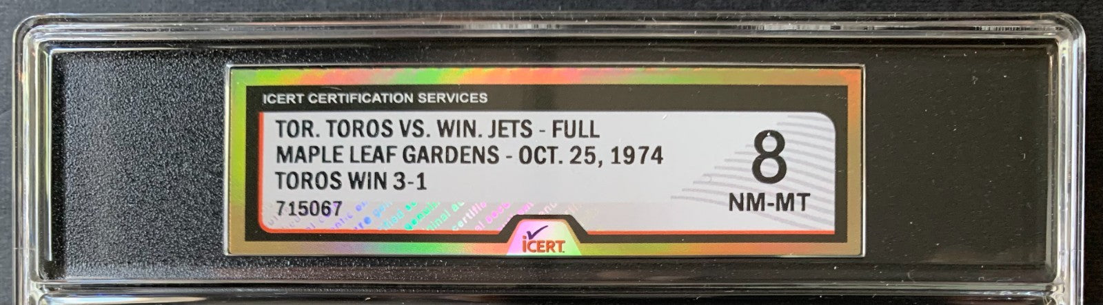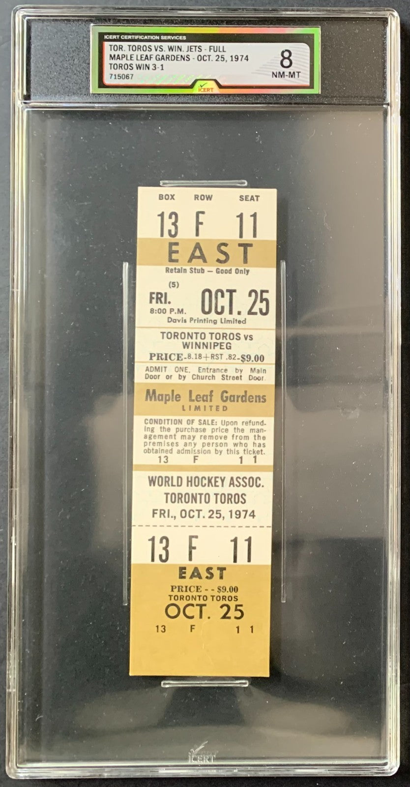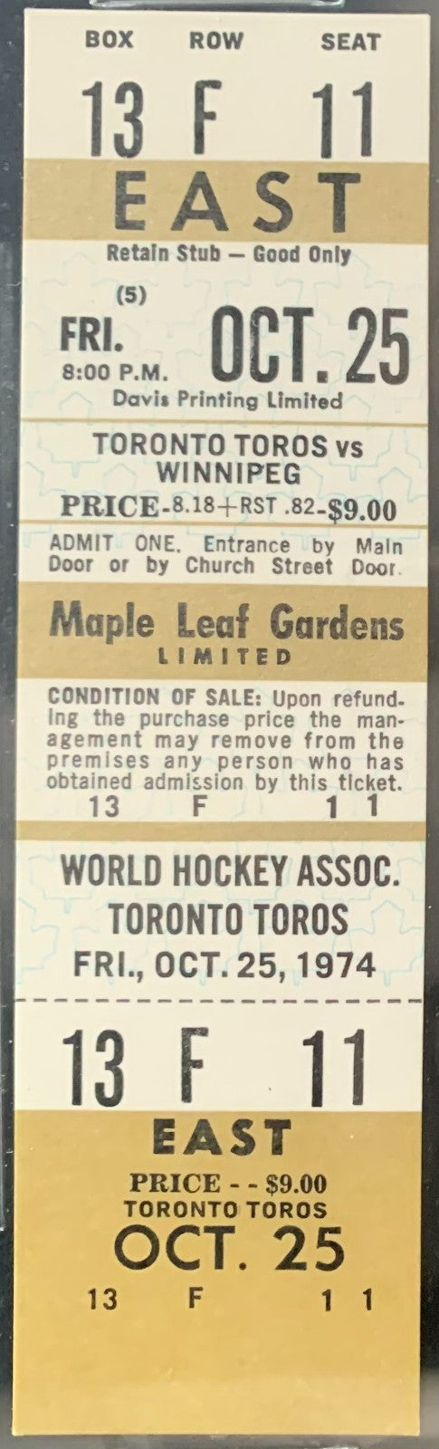 - WHA full ticket for Oct. 25, 1974 game at Maple Leaf Gardens in Toronto between the Toronto Toros and Bobby Hull's Winnipeg Jets. Toros defeat Jets 3-1