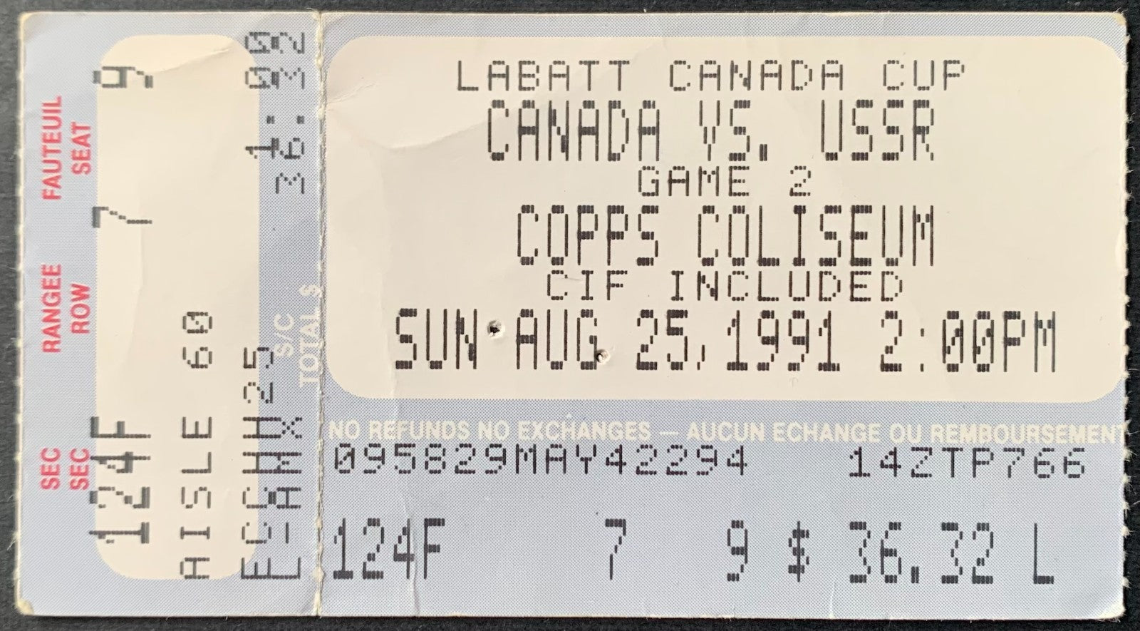 - Aug. 25, 1991 ticket stub for Canada Cup game at Copps Coliseum in Hamilton between the Team Canada and Team USSR. Canada beats USSR 4-2