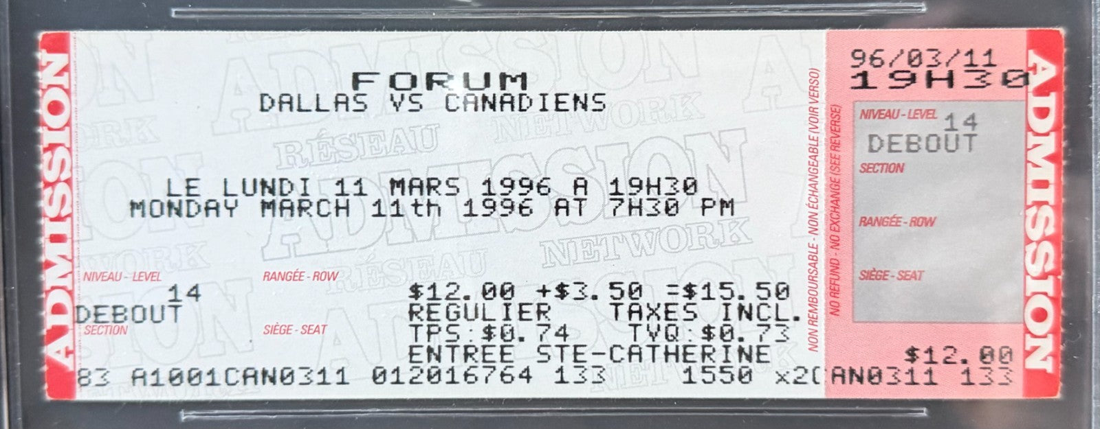- Full ticket for Mar. 11, 1996 final game at The Forum in Montreal between the Montreal Canadiens and Dallas Stars. Canadiens defeat Stars 4-1