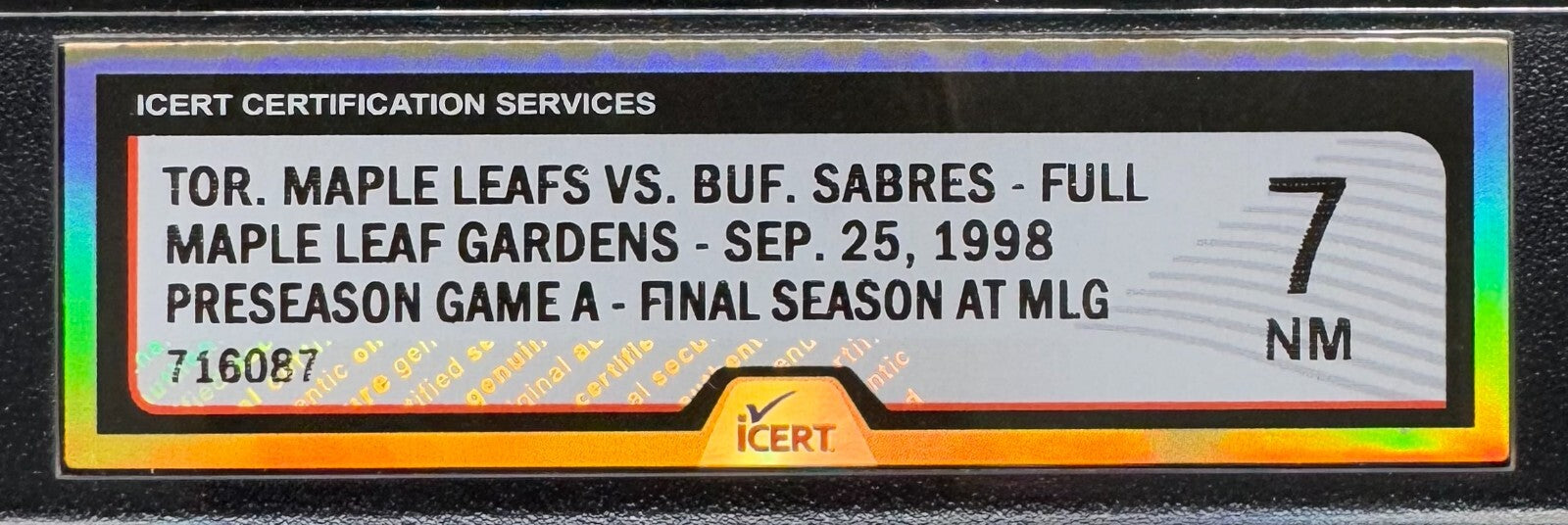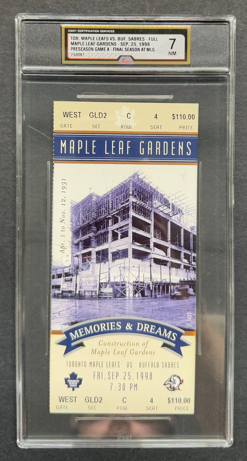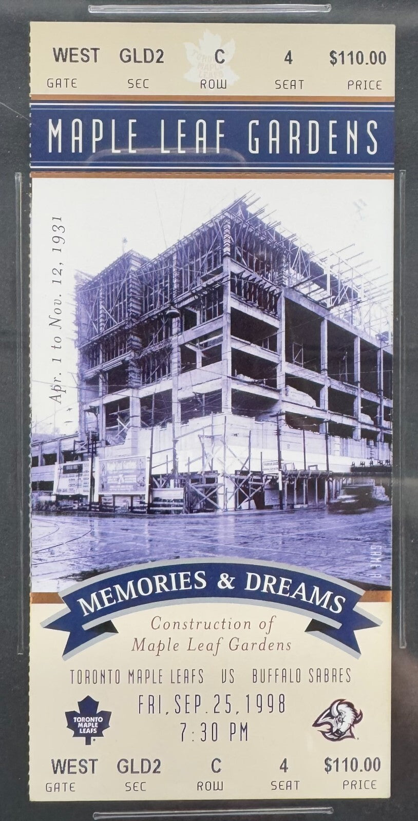 - Ticket for pre-season game A on Sept. 25, 1998 for the final season at Maple Leaf Gardens. Toronto Maple Leafs vs the Buffalo Sabres