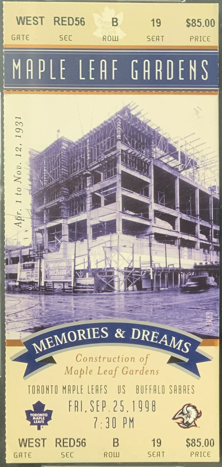 • Full ticket for Sept. 25, 1998 preseason game A for final season at Maple Leaf Gardens where the Toronto Maple Leafs played the Buffalo Sables. Maple Leafs beat Sabres 6-2