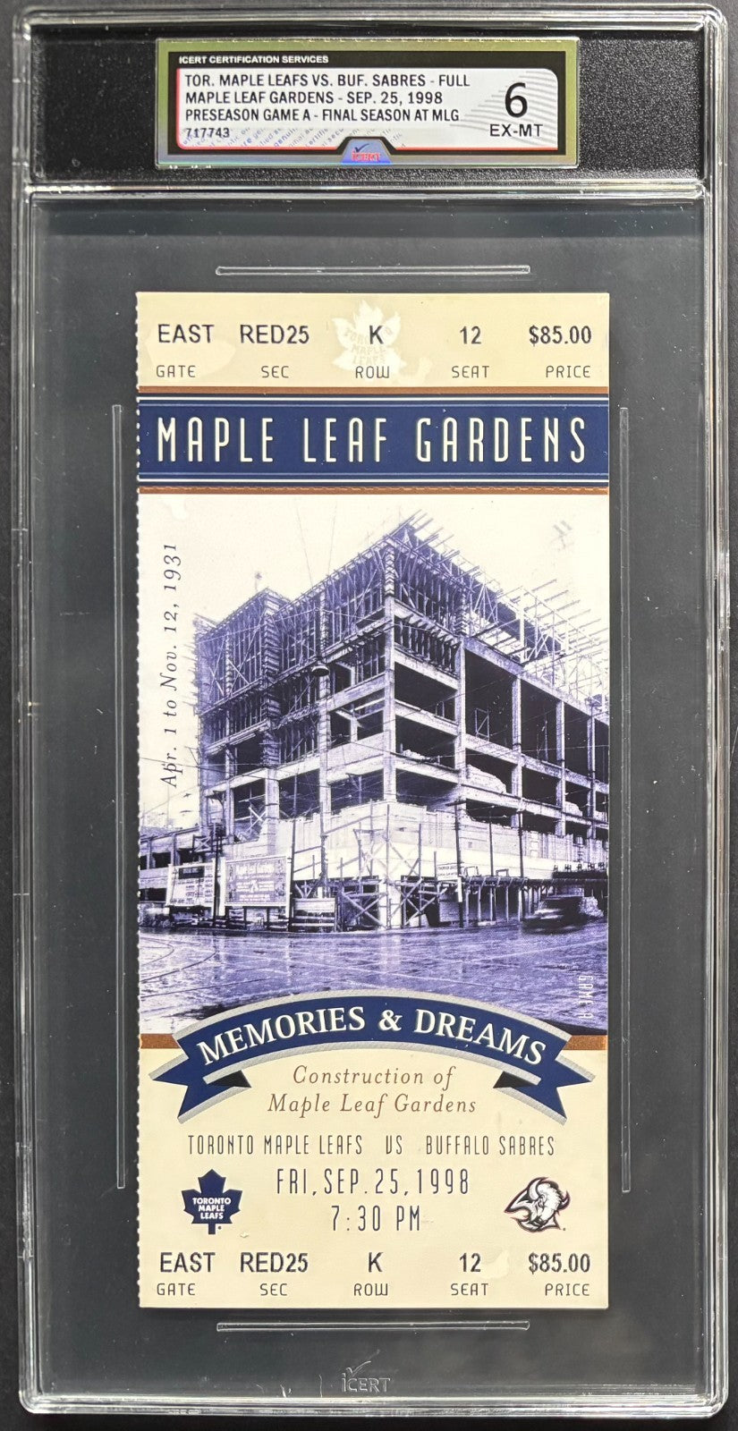 1998 Toronto Maple Leafs Vs Buffalo Sabres Full Ticket iCert 6 EX-MT NHL MLG