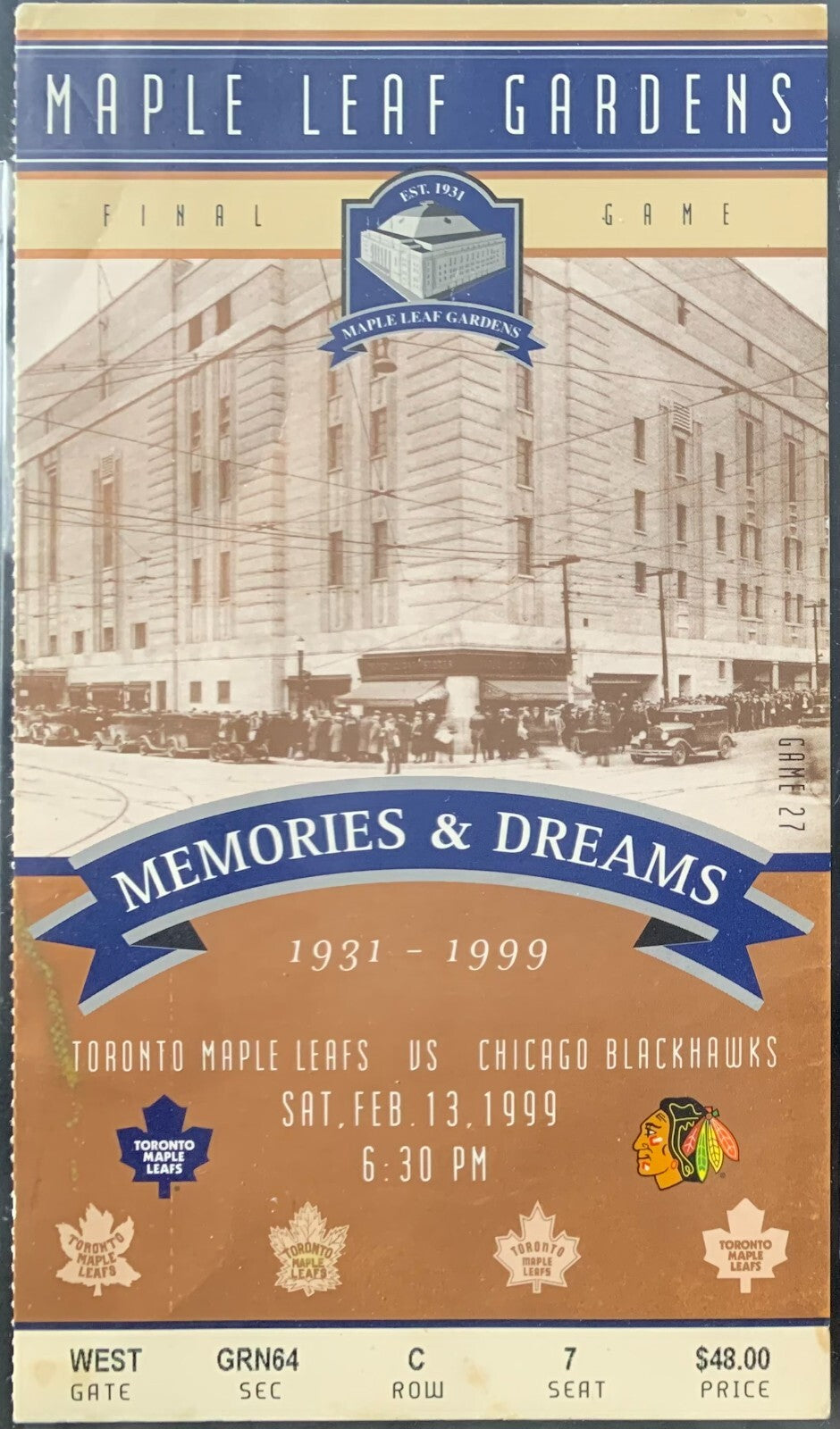 - Final NHL game at Maple Leaf Gardens on Feb. 13, 1999 between the Toronto Maple Leafs and Chicago Blackhawks -- Blackhawks beat Leafs 6-2