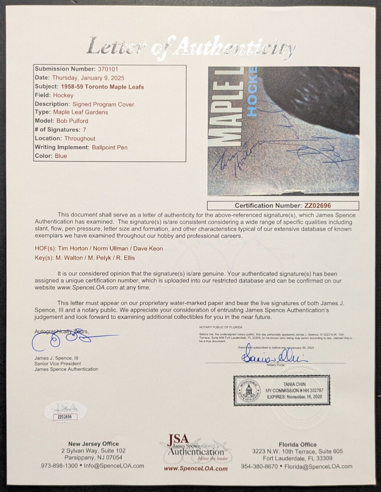 - Authenticated by JSA with a full letter of Authenticity, however the LOA incorrectly states that the signers of this item are the 1958-59 Toronto Maple Leafs. Signed in blue ballpoint pen and removed carefully from its original publication