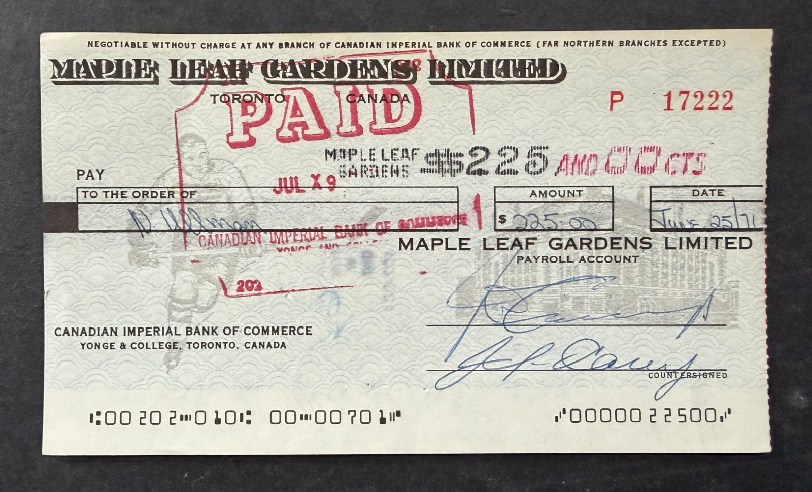 - Maple Leafs Jun. 25, 1971 cheque to player HOFer Norm Ullman signed by Ullman and Donald Crump