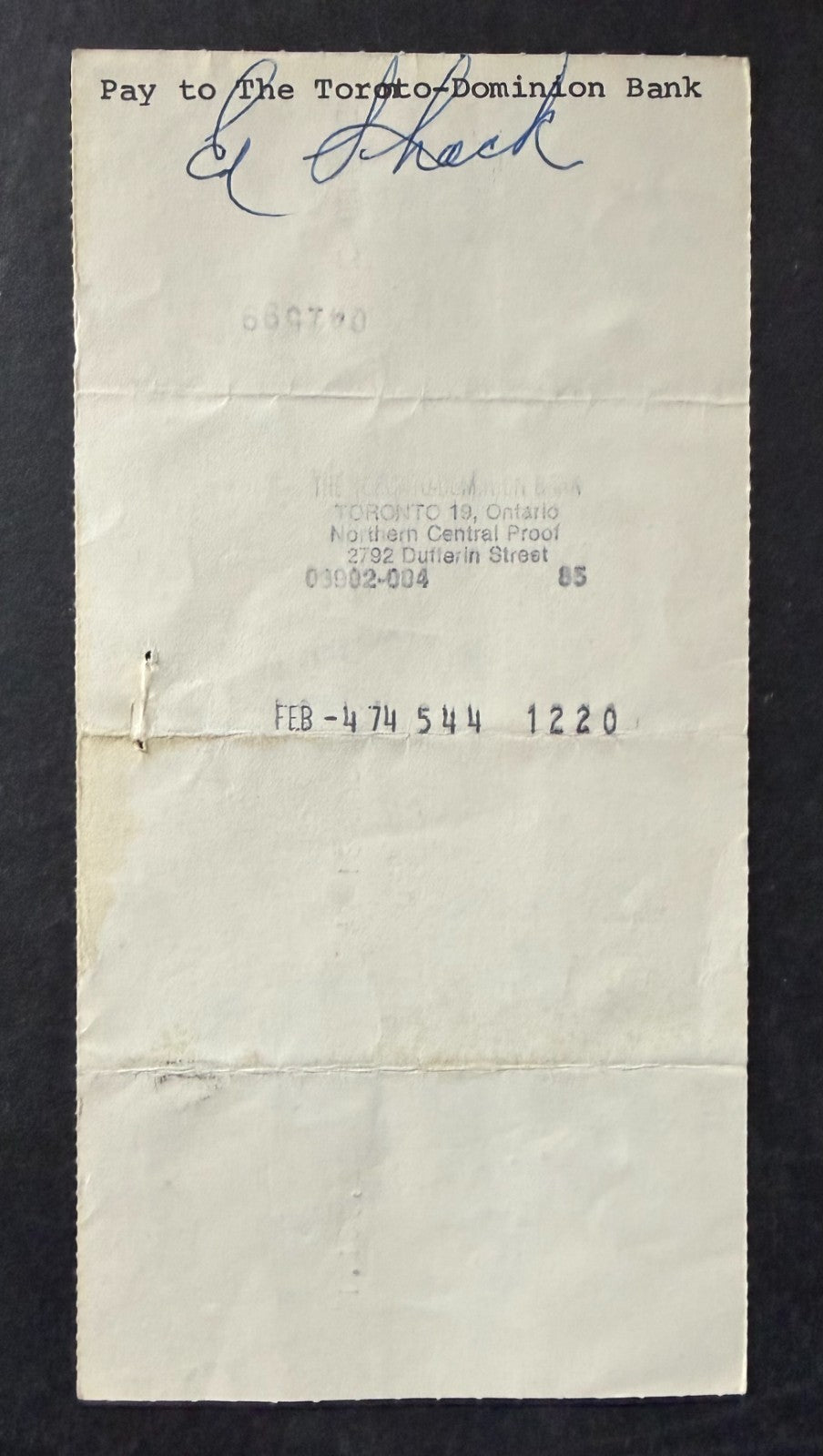 - 1974 Eddie Shack Donald Crump Jim Gregory Signed Cheque