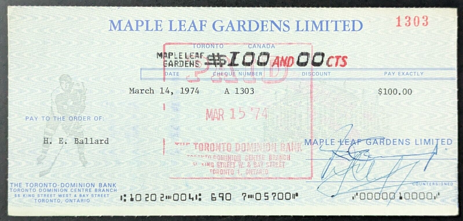 1974 Maple Leaf Gardens Cheque / Check Signed Harold Ballard Autographed NHL