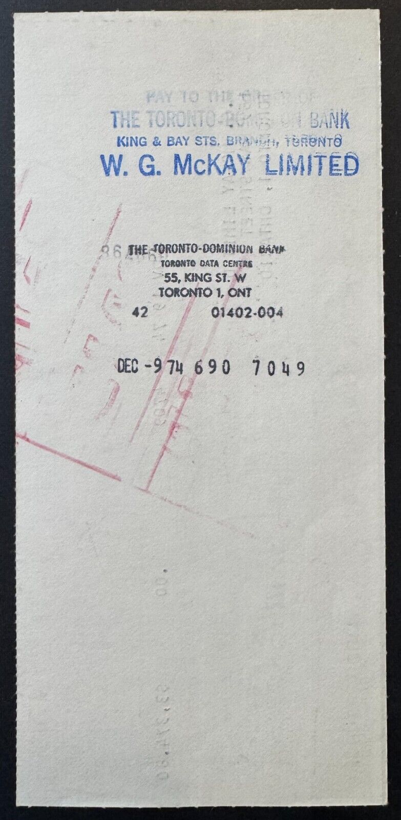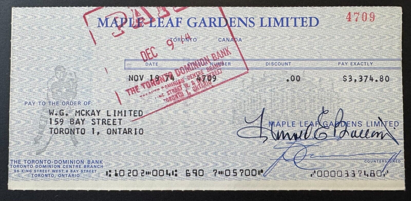 - 1974 Maple Leaf Gardens Cheque Signed By Owner Harold Ballard + CFO Donald Crump