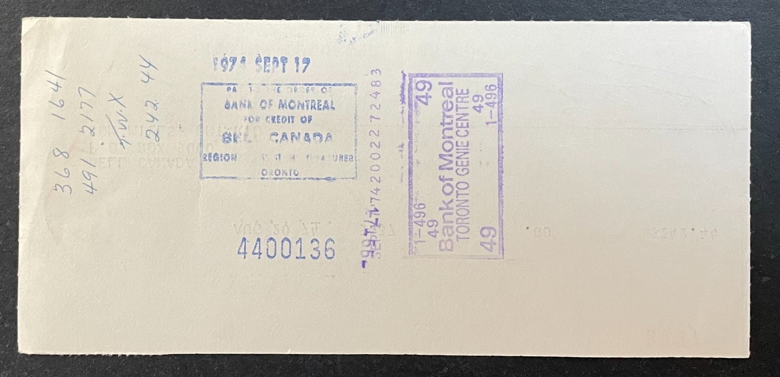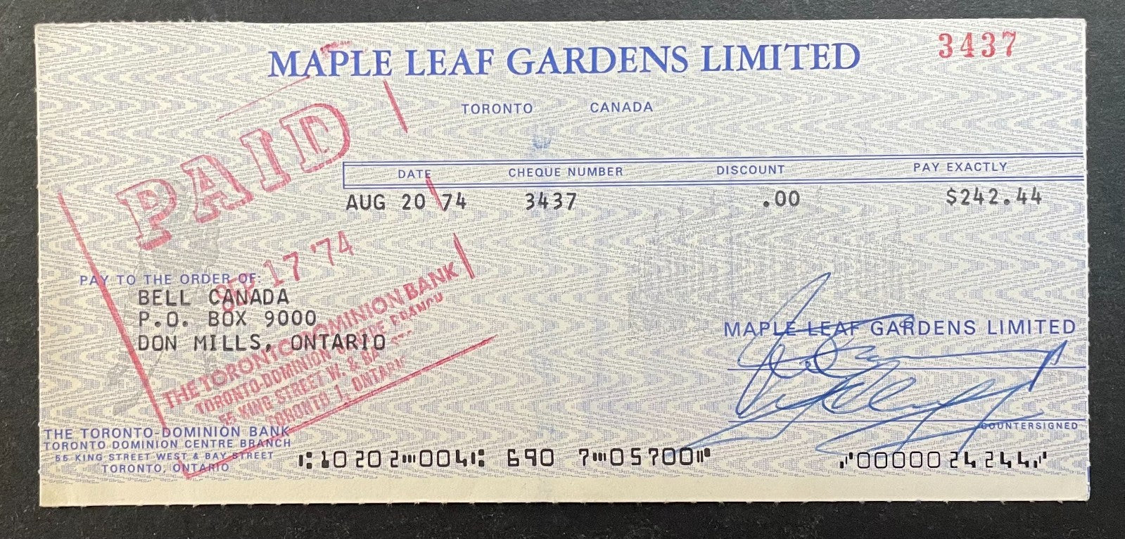 - 1974 Maple Leaf Gardens Cheque Signed By Donald Crump