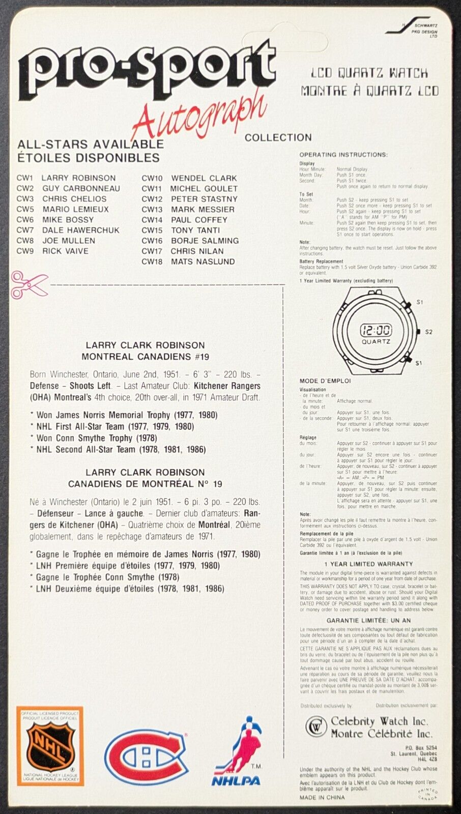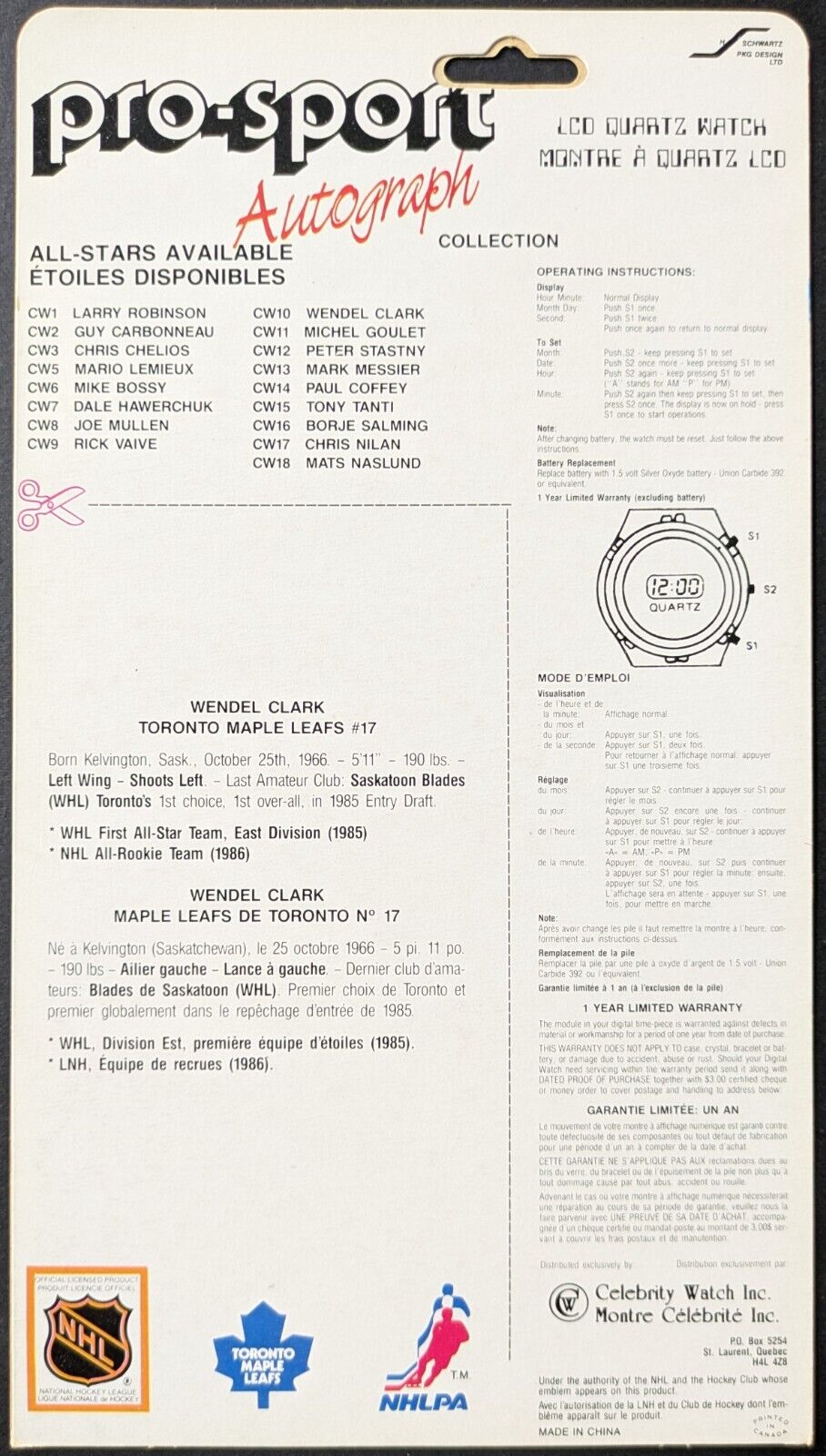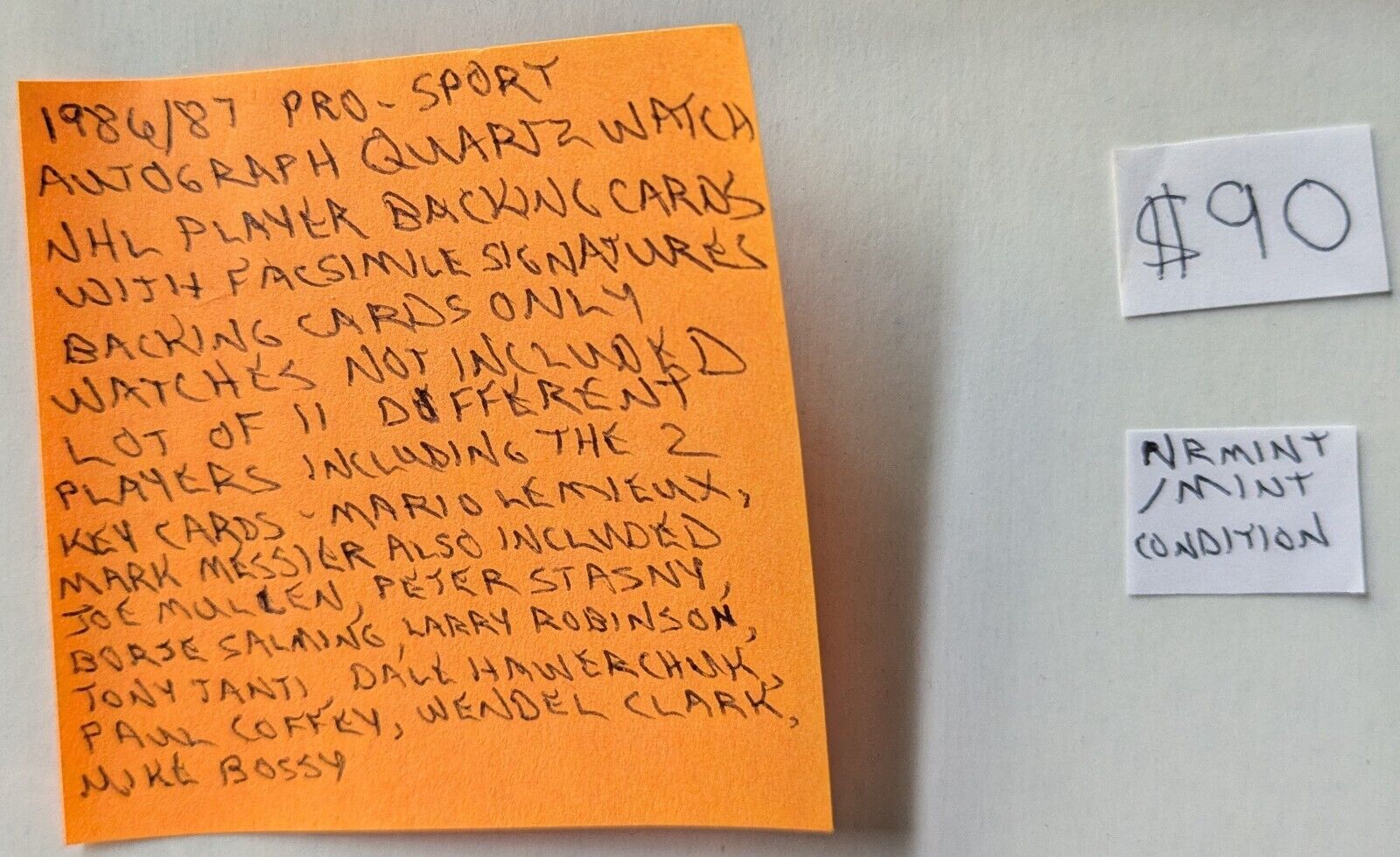 - 1986/87 Pro-Sport autograph quartz watch NHL player backing cards with facsimile signatures