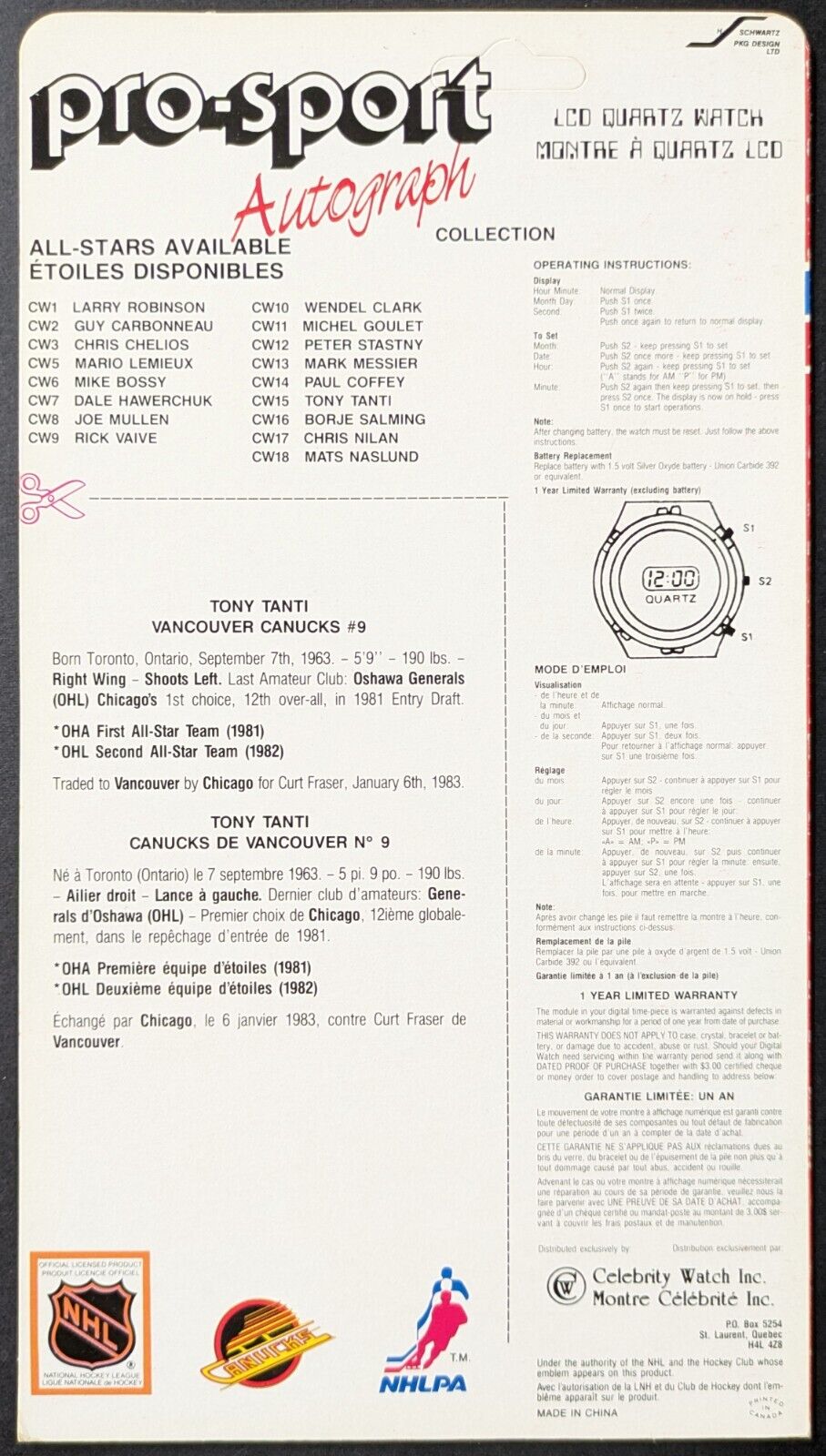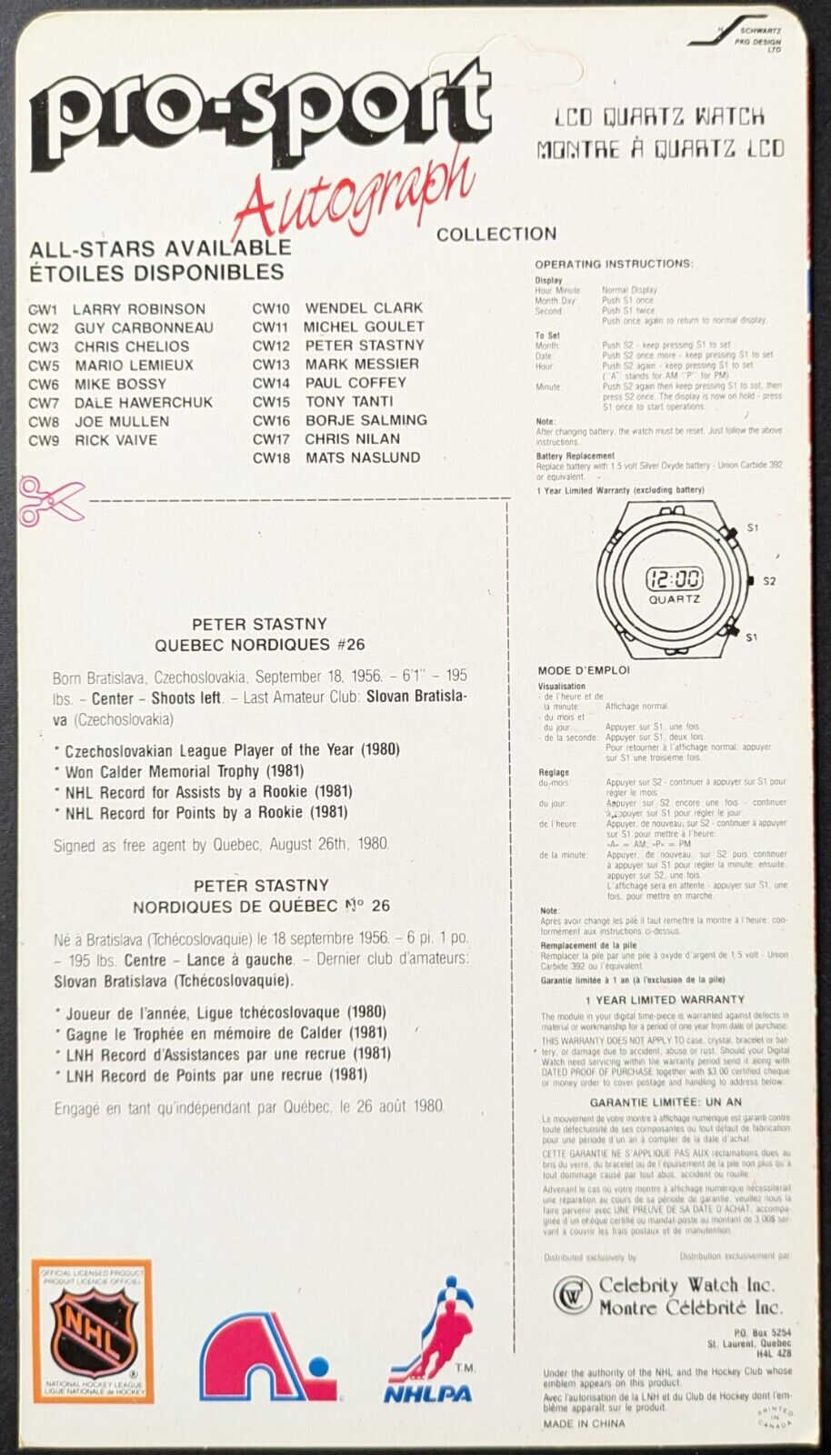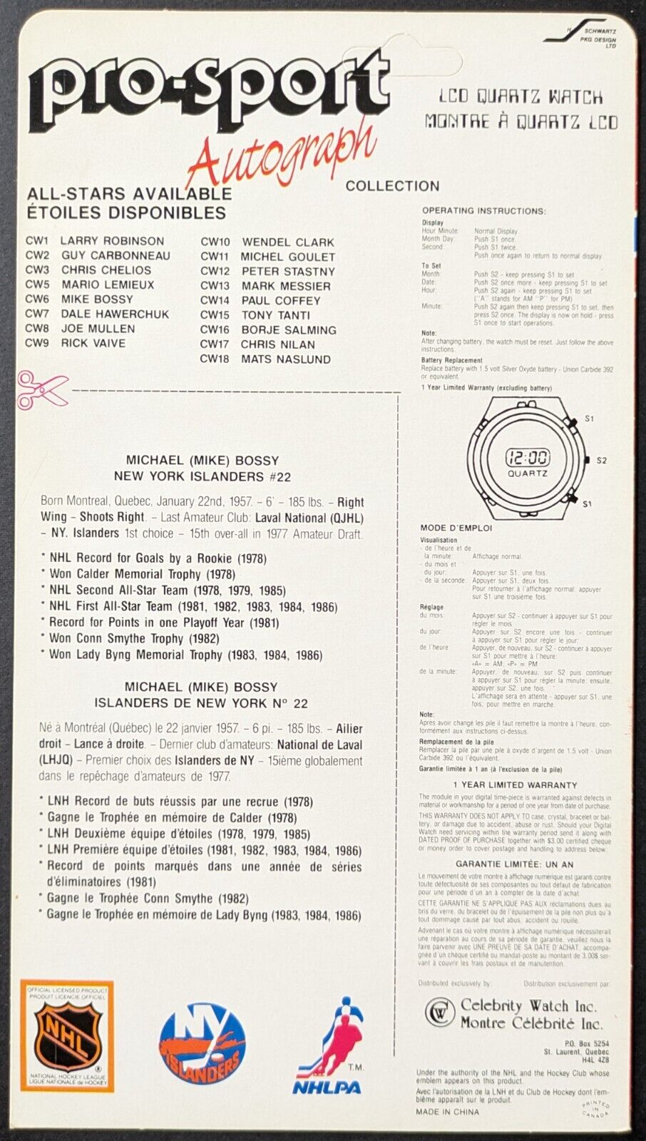 - 1986/87 Pro-Sport autograph quartz watch NHL player backing cards with facsimile signatures