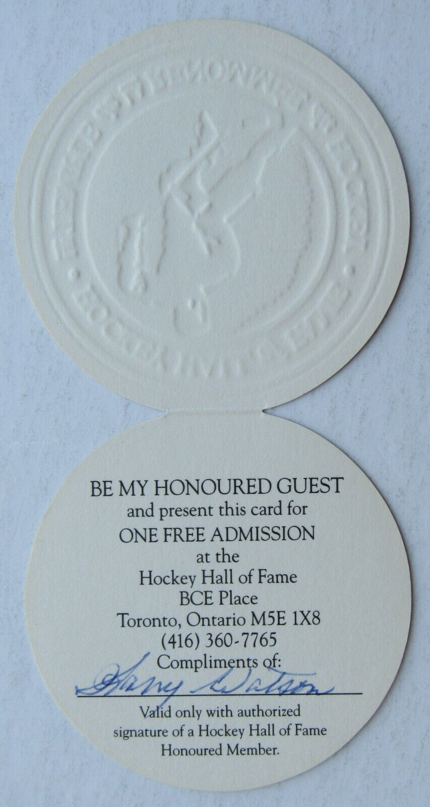 1994 Hockey Hall Of Fame Harry Watson Admission Pass Signed Autographed NHL