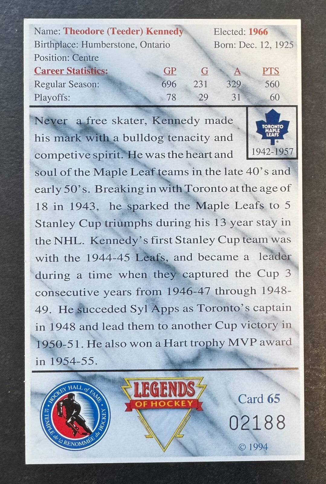 - Kennedy played his entire career with the Toronto Maple Leafs from 1943 to 1957