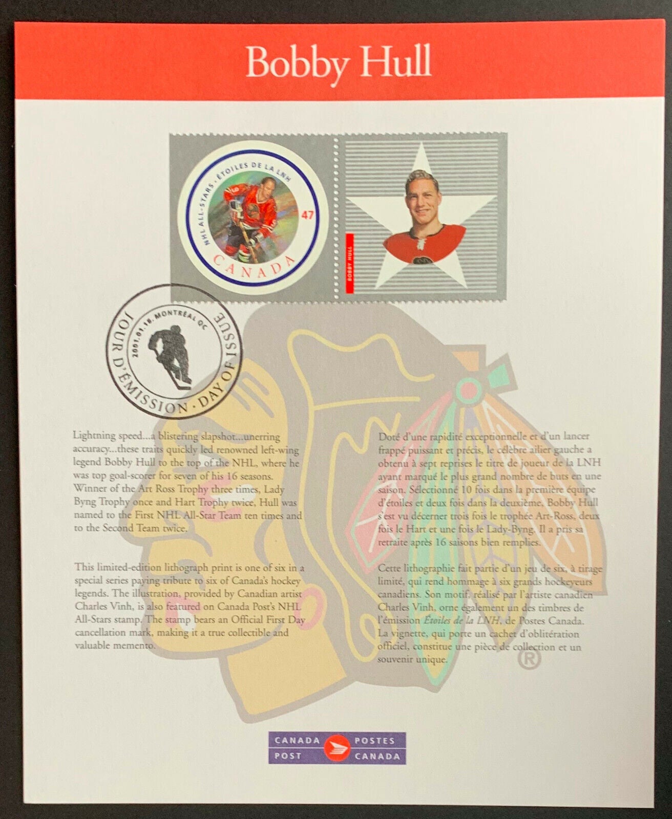 - 2001 NHL All-Stars limited edition lithograph and stamp set featuring Bobby Hull