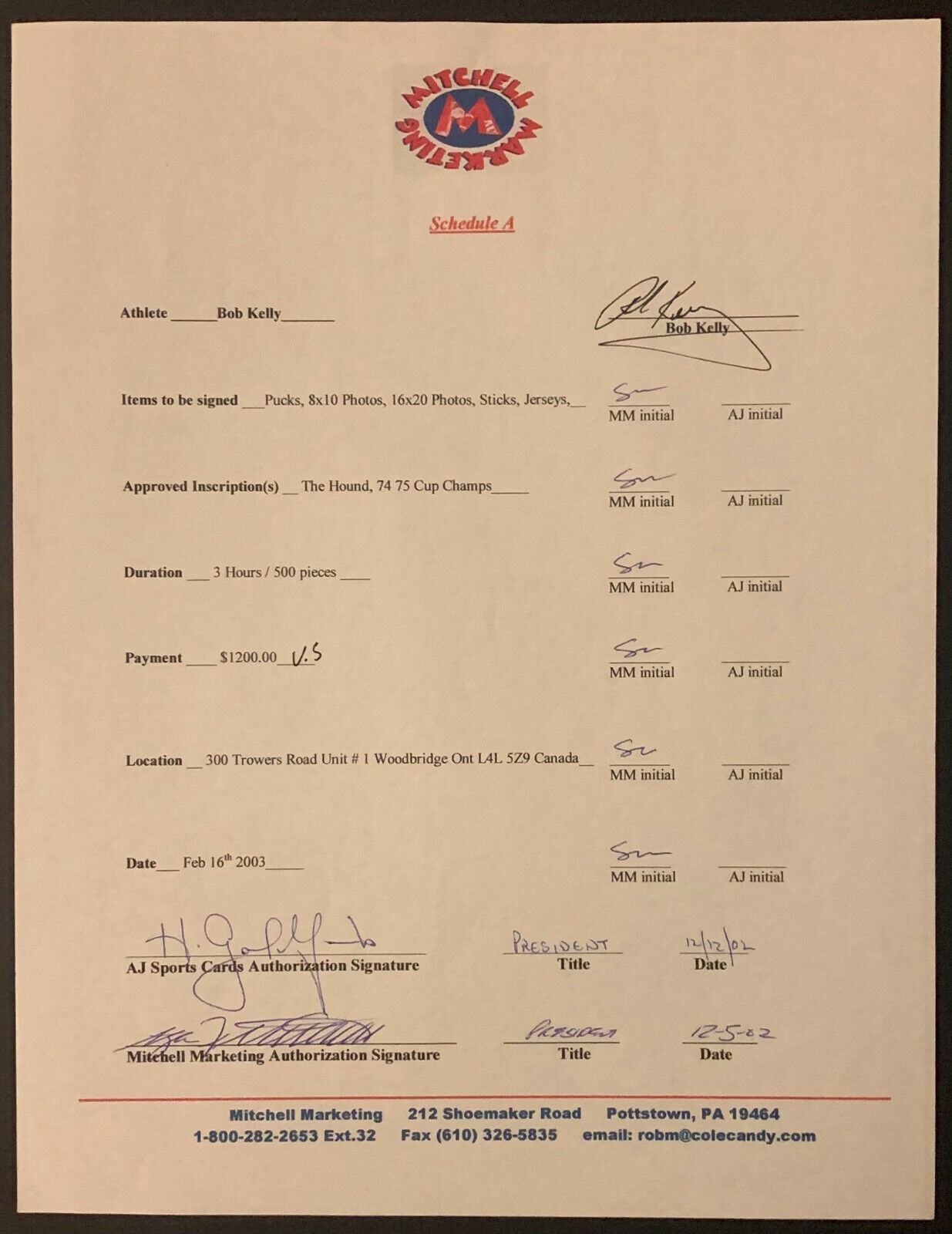 2003 Bob Kelly Signed Contract NHL Flyers Mitchell Marketing Appearances AJ
