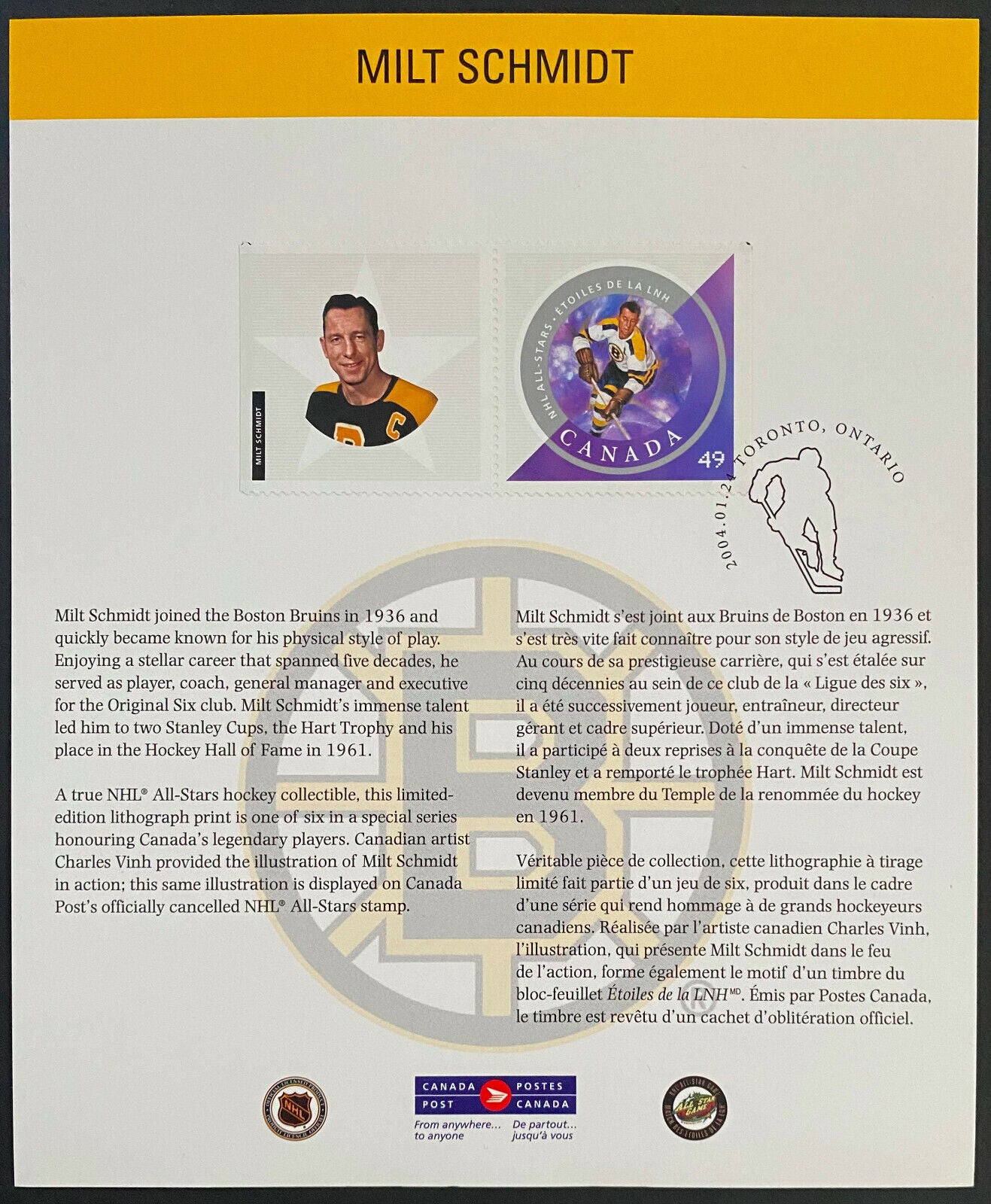 • 2004 NHL All-Stars limited edition lithograph and first day of issue stamp set featuring Milt Schmidt
