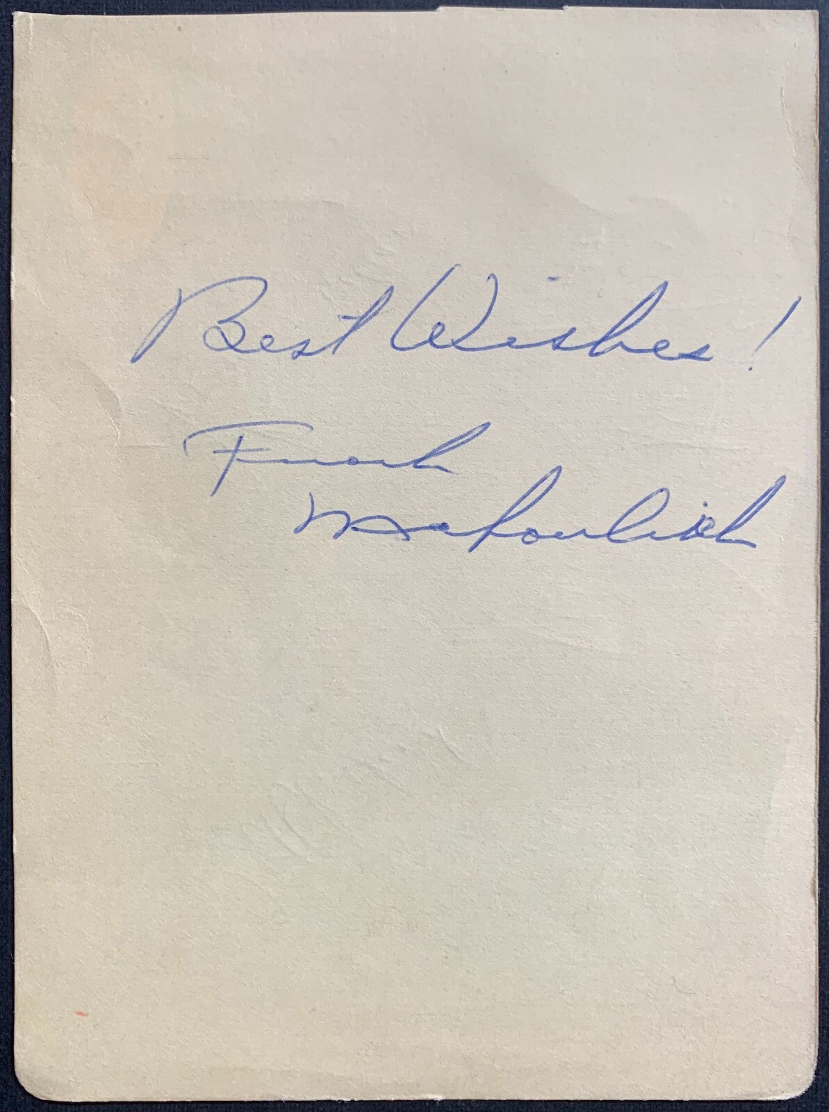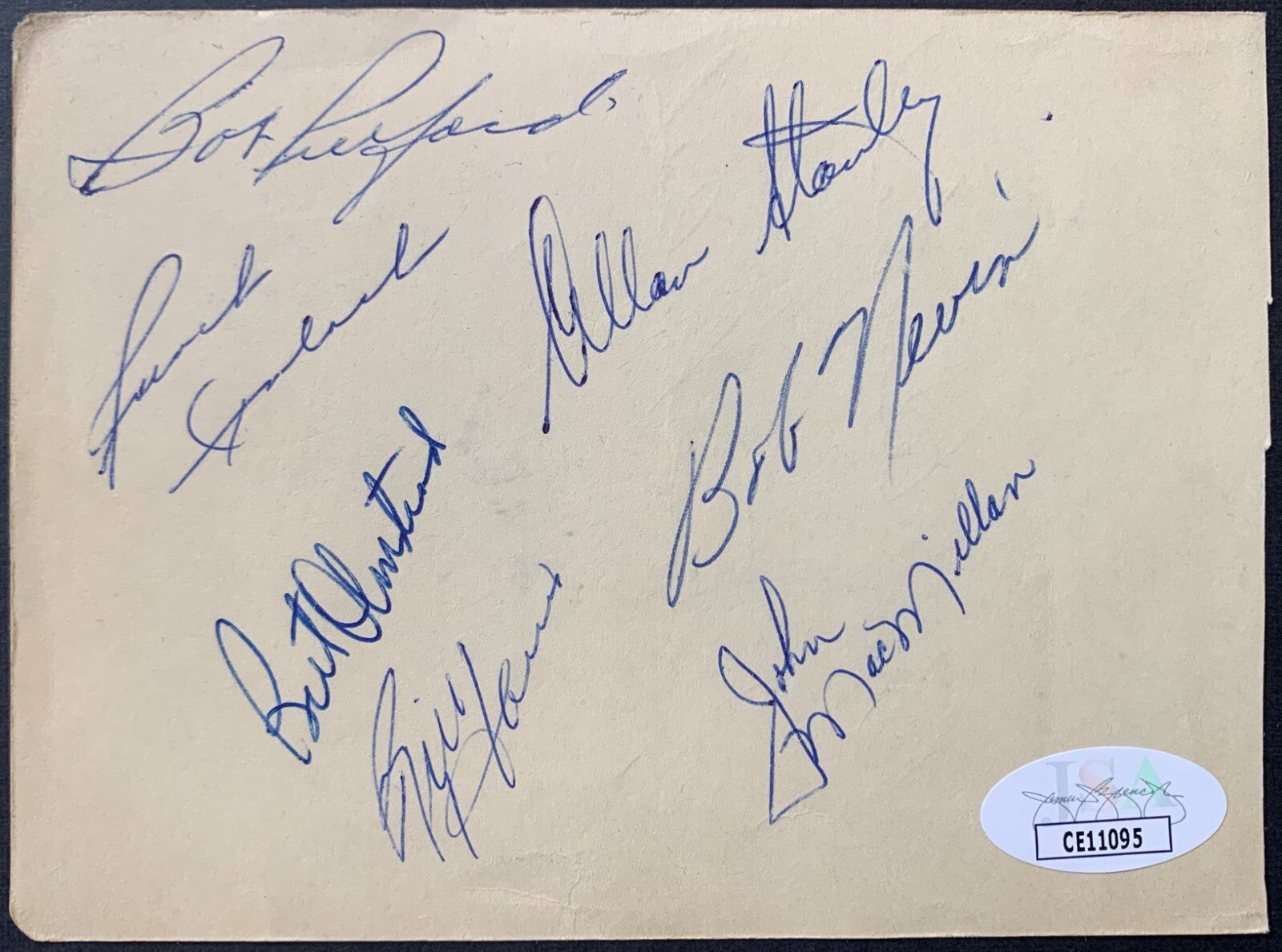 • Signed card includes: Bob Pulford HOF, Punch Imlach HOF, Allan Stanley HOF, Bert Olmstead, Billy Harris, Bob Nevin and John MacMillan. On other side, signature of Frank Mahovlich HOF