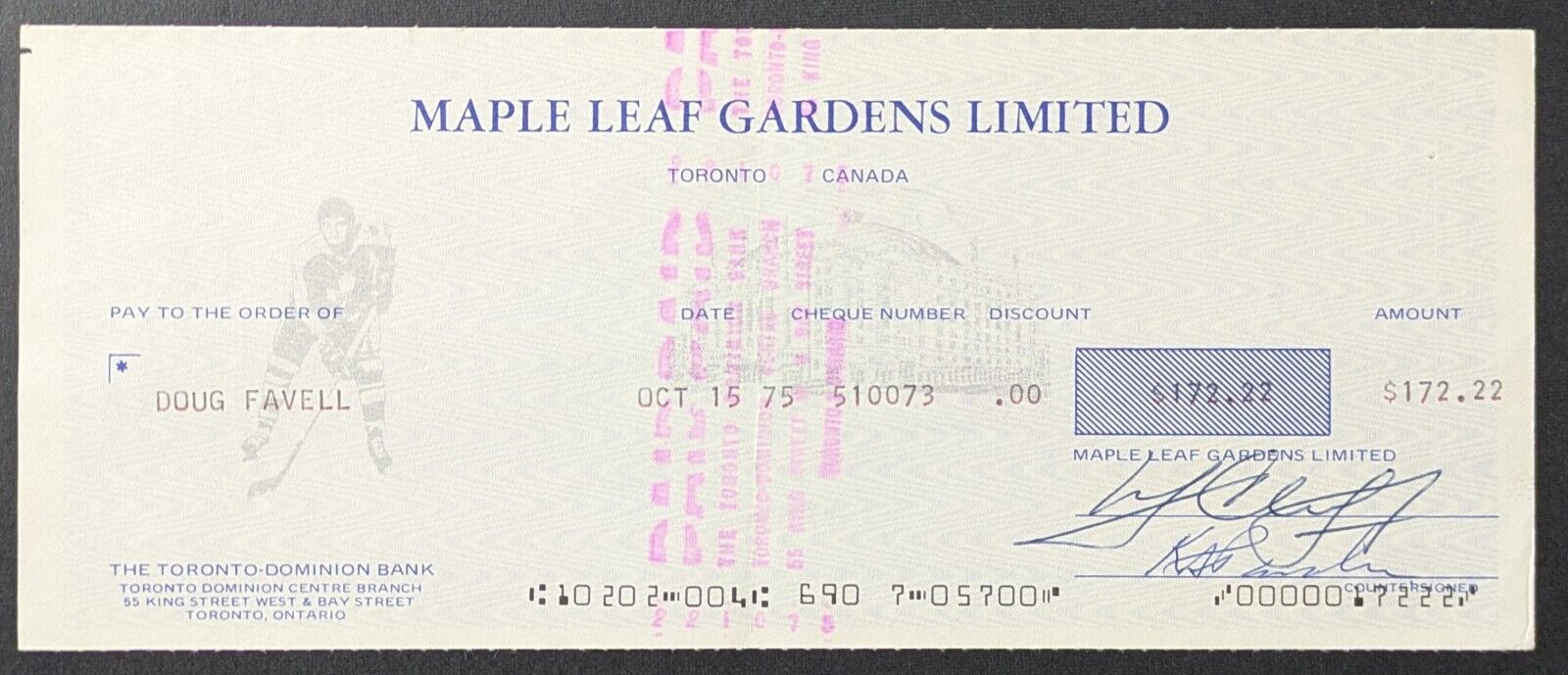 • Toronto Maple Leafs Cheque To Goalie Doug Favell Signed By Donald Crump
