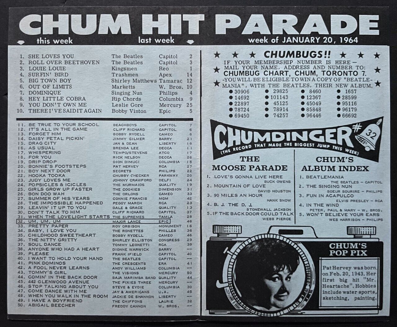 - 1964 Chum Charts with Beatles 1st time on the front cover + the 1st time the Beatles chart #1 song (She Loves You)