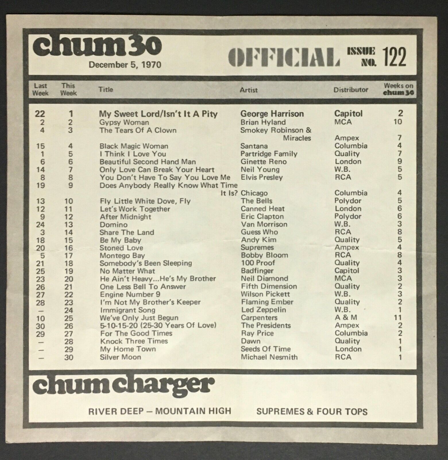 1970 CHUM Radio Survey Music Chart Toronto Brian Hyland Santana Led Zeppelin