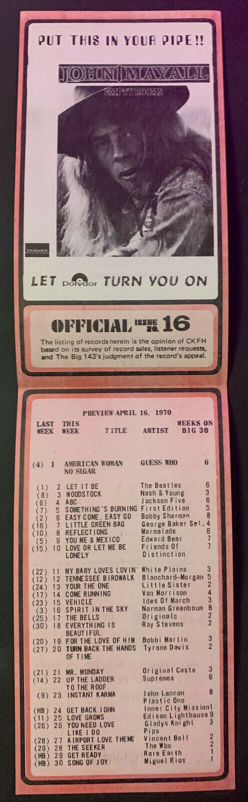 - 1970 week of April 16th, radio survey record chart