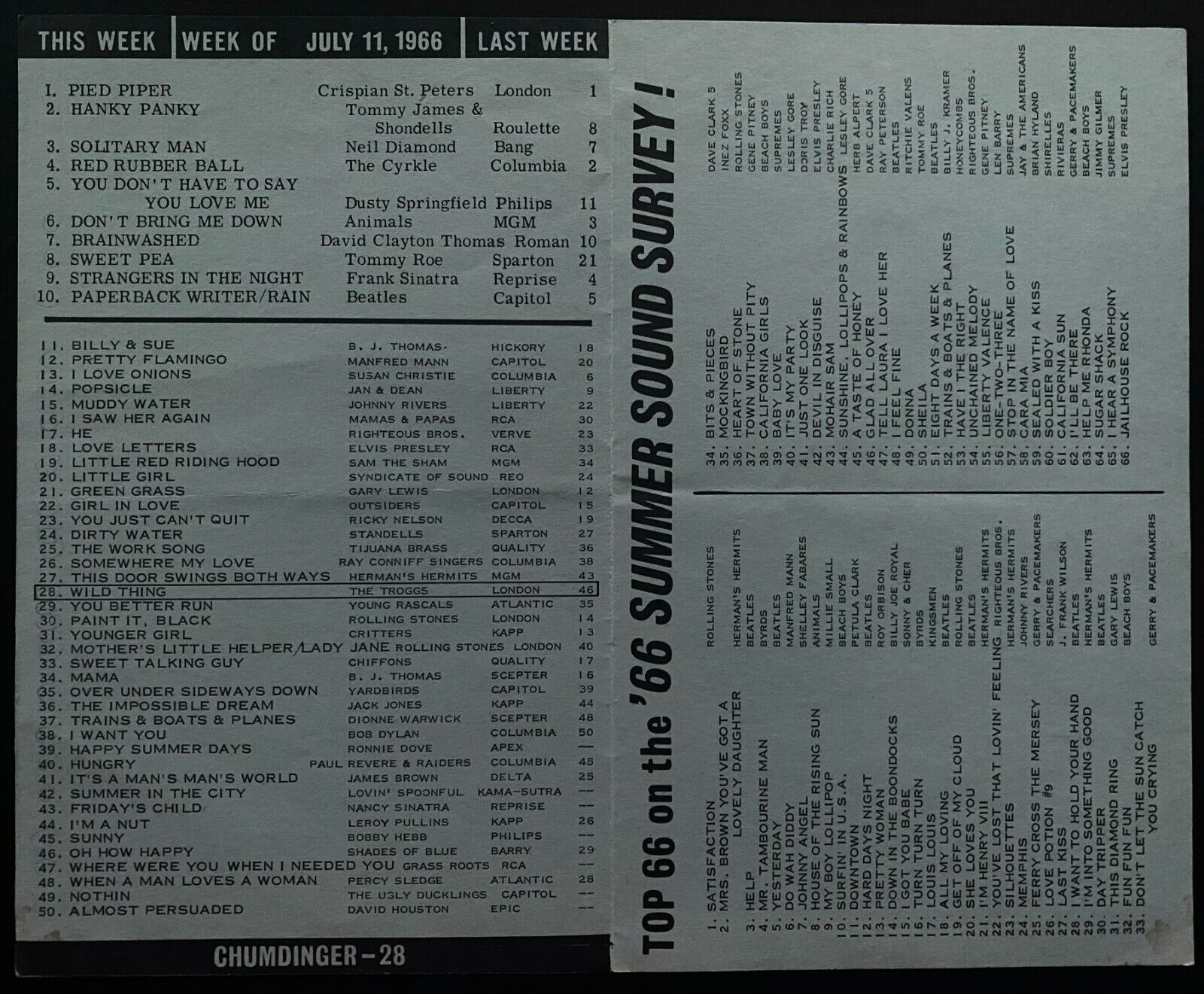 • Vintage Chum Radio Music Chart Top 66 Rock Songs for the week of July 11, 1966