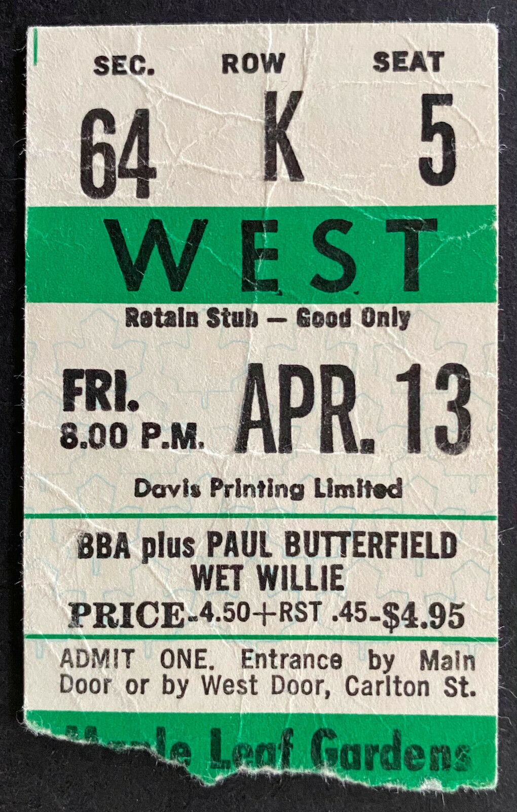 - April 13th 1973 Maple Leaf Gardens Beck Bogart Appice With Paul Butterfield Blues Band Concert Ticket