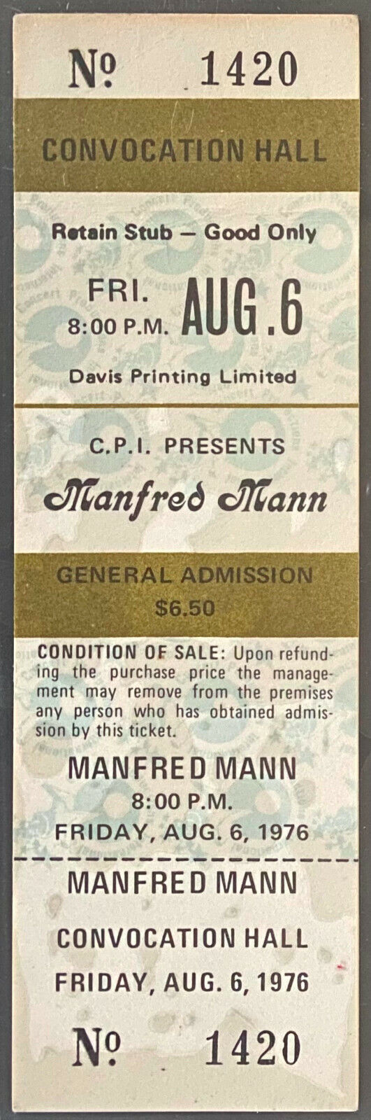 • Aug 6, 1976 Manfred Mann Convocation Hall Full Concert Ticket. Toronto