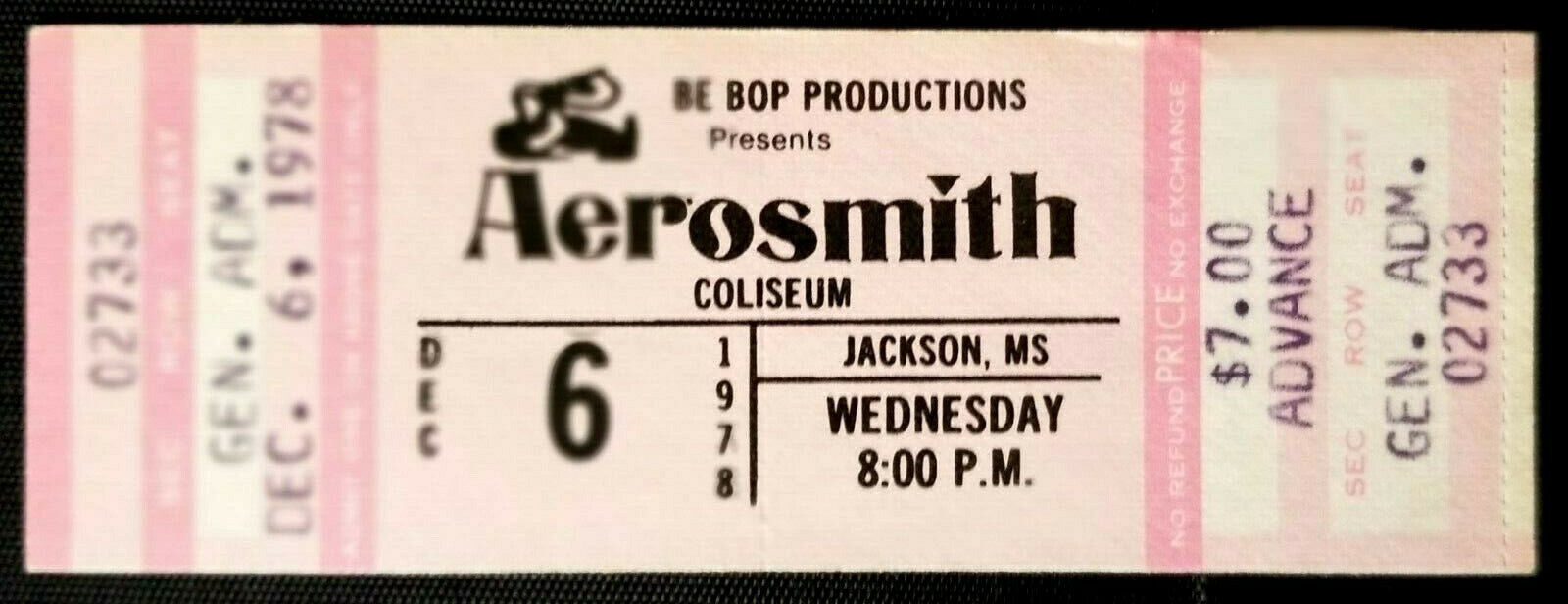 - December 6 1978 Aerosmith Concert Full Ticket at the Coliseum in Jackson Mississippi