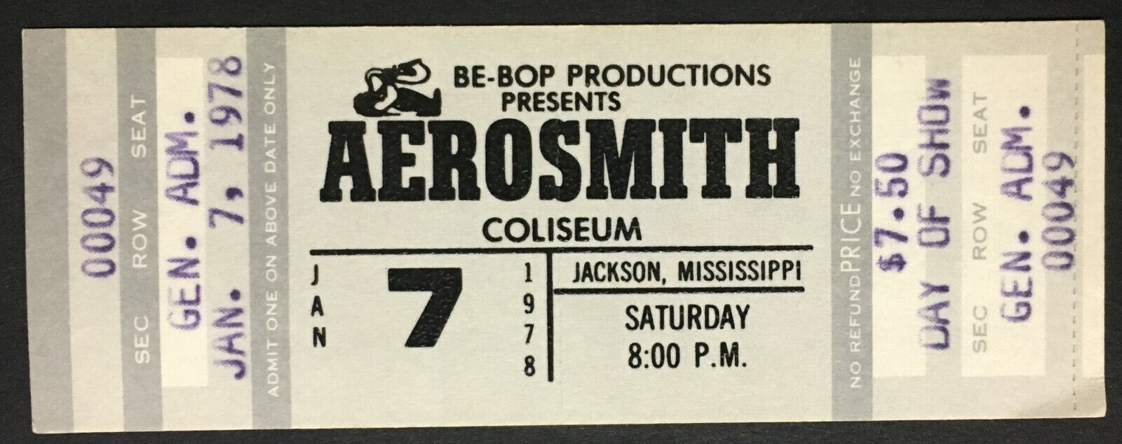 1978 Aerosmith Concert Ticket Mississippi Coliseum Unused Vintage Music Tyler