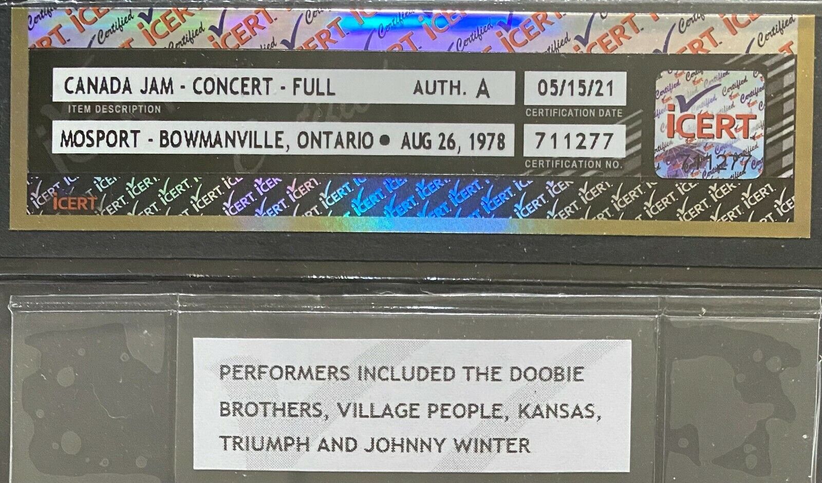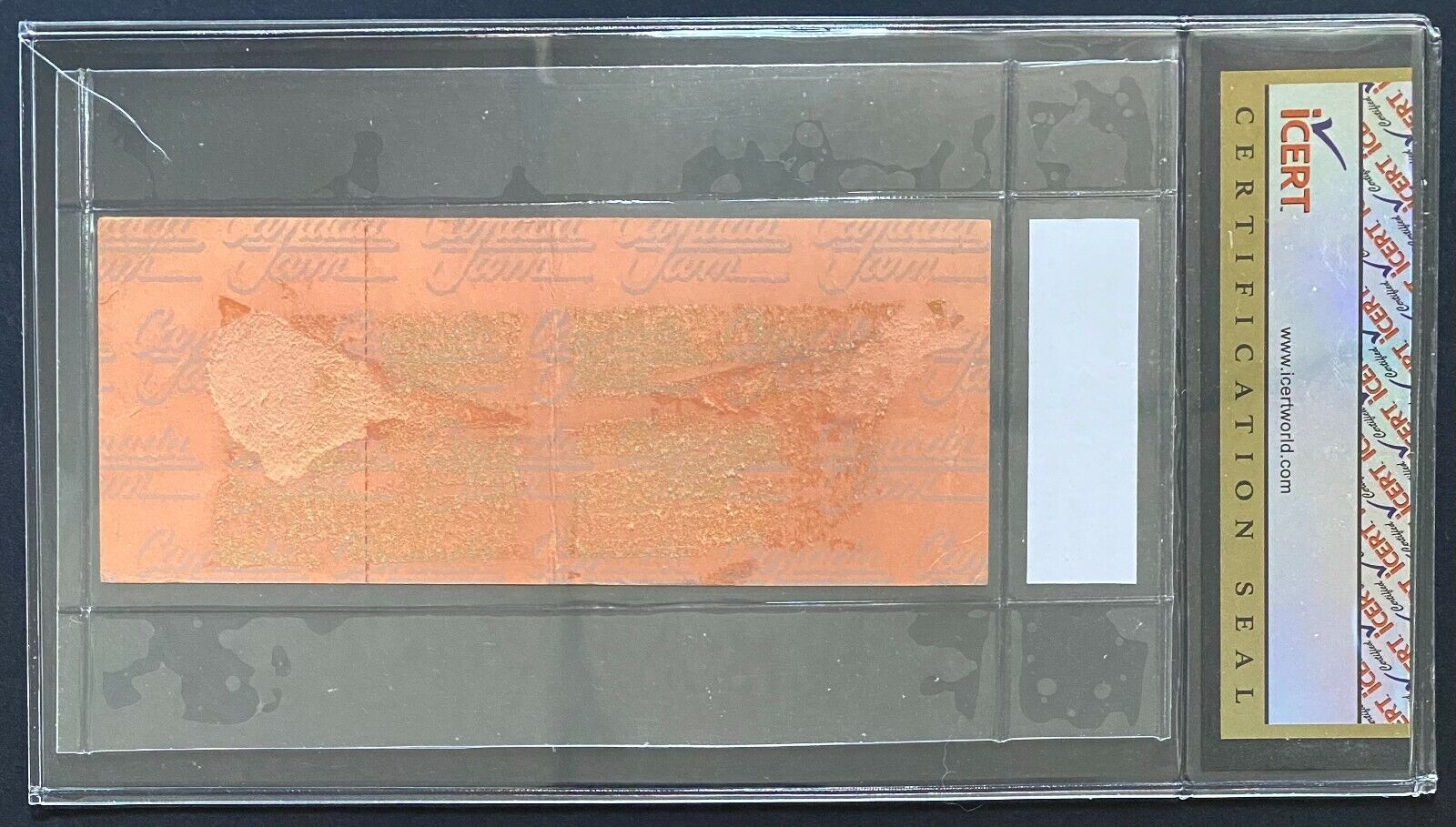 - Slabbed and authenticated by iCert. Ticket itself is in very good condition; some light edge creasing as well as some minor soiling on the front and some glue damage on the back including some surface paper loss