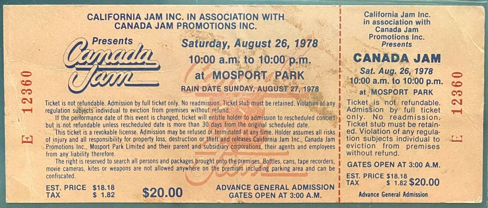- August 26, 1978 ticket for Canada Jam music festival at Mosport Park in Bowmanville, Ontario