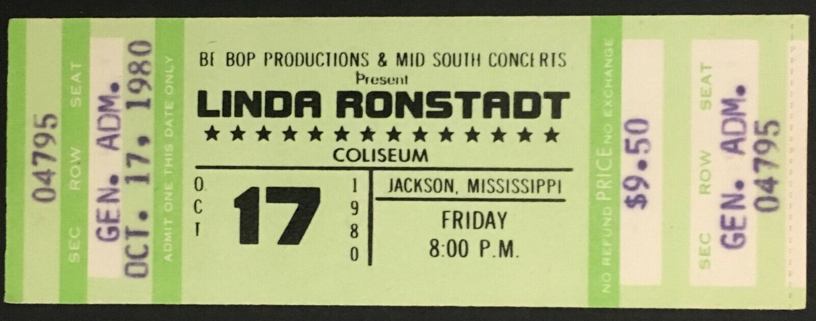 • Vintage 1980 Linda Ronstadt full concert ticket from Jackson, Mississippi Coliseum